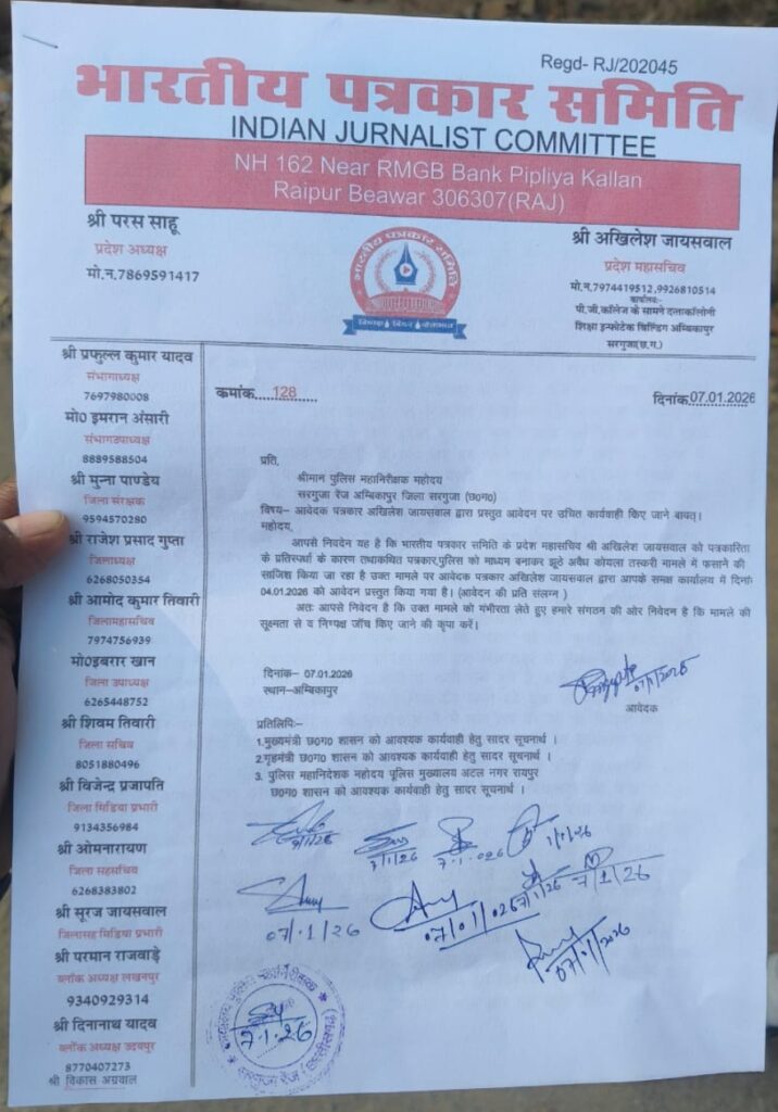 भारतीय पत्रकार समिति द्वारा अंबिकापुर स्थित सरगुजा रेंज के पुलिस महानिरीक्षक को एक महत्वपूर्ण ज्ञापन सौंपा गया है। ज्ञापन में कोयला तस्करी के कथित मामले में भारतीय पत्रकार समिति के प्रदेश महासचिव अखिलेश जायसवाल पर लगाए गए झूठे आरोपों की निष्पक्ष एवं सूक्ष्म जांच की मांग की गई है। समिति का कहना है कि अखिलेश जायसवाल को साजिश के तहत फंसाने का प्रयास किया गया है, जिससे पत्रकार समुदाय में भारी रोष व्याप्त है।