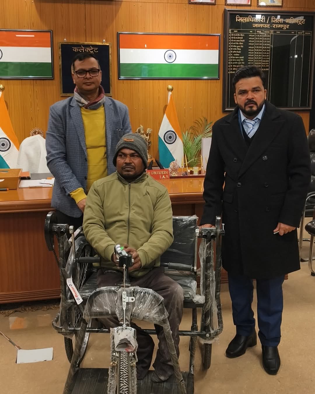 Rampur में आयोजित जनता दर्शन कार्यक्रम के दौरान जिलाधिकारी अजय कुमार द्विवेदी एवं मुख्य विकास अधिकारी श्री गुलाब चन्द्र ने तहसील स्वार के ग्राम पंचायत मानुल्लापुर निवासी दिव्यांगजनों श्री वृद्धसेन एवं दिव्यांग श्रीमती ममता को ट्राईसाइकिल प्रदान की।