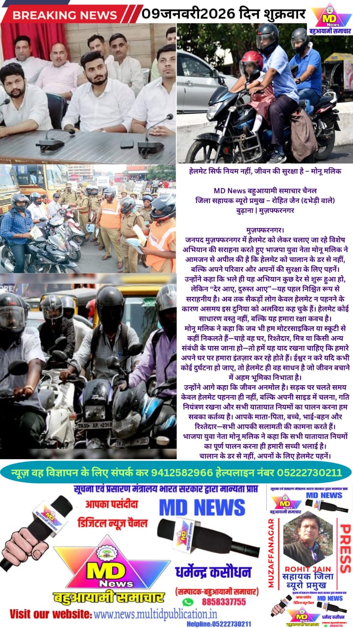 जनपद मुज़फ्फरनगर में हेलमेट को लेकर चलाए जा रहे विशेष अभियान की सराहना करते हुए भाजपा युवा नेता मोनू मलिक ने आमजन से अपील की है कि हेलमेट को चालान के डर से नहीं, बल्कि अपने परिवार और अपनों की सुरक्षा के लिए पहनें।