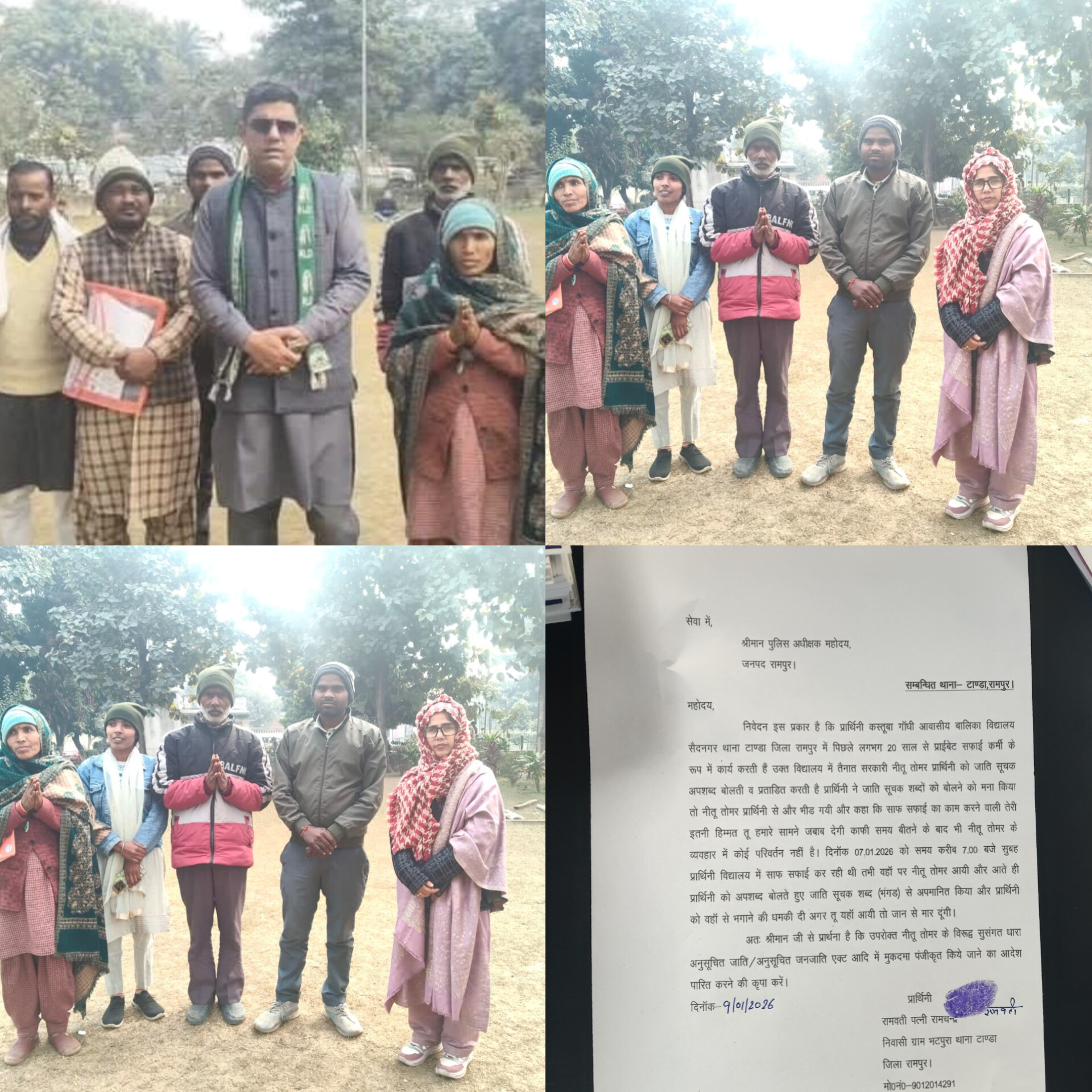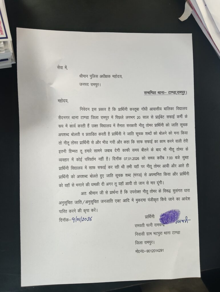 आज राष्ट्रीय लोक दल अल्पसंख्यक प्रकोष्ठ के प्रदेश महासचिव मोहम्मद उस्मान बबलू महिला प्रकोष्ठ की प्रदेश सचिव निगार बेगम के नेतृत्व में ग्राम पंचायत भटपुरा सैद नगर की सफाई कर्मचारी दलित रामवती जिला कलेक्टर में जिलाधिकारी रामपुर और पुलिस अधीक्षक महोदय से मुलाकात कर कस्तूरबा गांधी विद्यालय की अकाउंटेंट नीतू तोमर द्वारा रामवती को जाति सूचक शब्दों से अपमानित किया गया। मारपीट और जान से मारने की धमकी दी गई ।