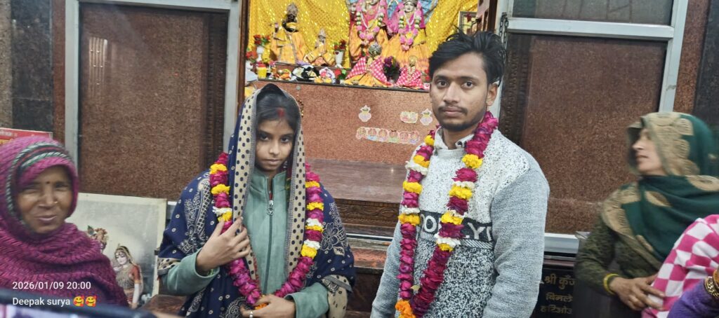 मुख्य: जनपद के कस्बा बाजना में तारीख 09/01/2026 दिन शुक्रवार को एक मामला सामने आया है अलीगढ़ से आई युवती सुबह 5 बजे अपने प्रेमी के घर पहुंची । युवक के घर वालों ने इसकी सूचना थाने में दी। युवती के घर वालो को इसकी जानकारी मिली तो वो भी युवक के गांव आ गए । युवती के घर वालों ने युवती को काफी समझाया लेकिन युवती ने यही बयान दिया कि मुझे इसी युवक से विवाह करना है। और बाद में दोनों पक्षों का आपस में समझौता हुआ दोनों पक्षों के हस्ताक्षर हुए फिर युवती पक्ष के घर वाले युवती को छोड़कर वापस अपने घर चले गए और युवक के घर वालों ने दोनों युवक और युवती की मंदिर में शादी में करा दी ।
