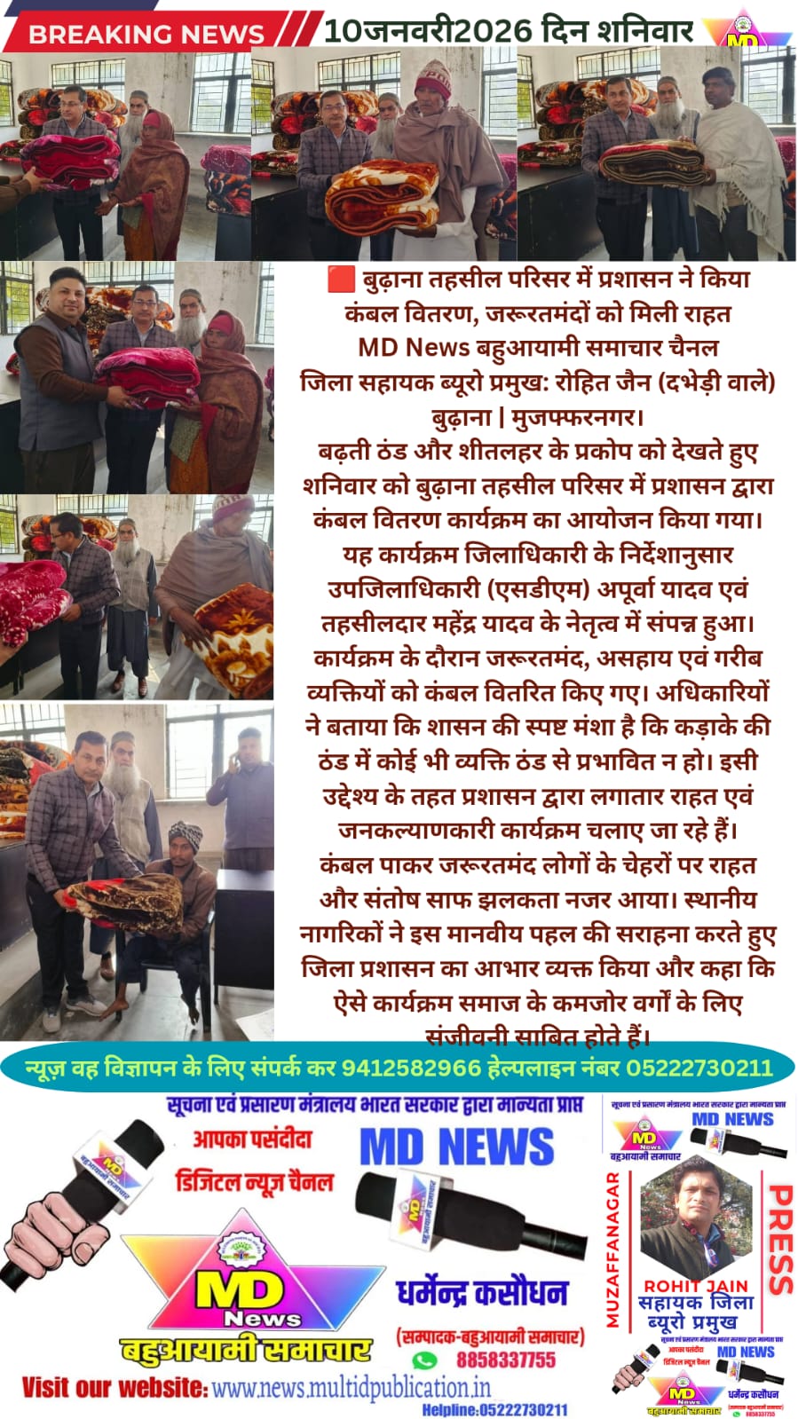 बढ़ती ठंड और शीतलहर के प्रकोप को देखते हुए शनिवार को बुढ़ाना तहसील परिसर में प्रशासन द्वारा कंबल वितरण कार्यक्रम का आयोजन किया गया। यह कार्यक्रम जिलाधिकारी के निर्देशानुसार उपजिलाधिकारी (एसडीएम) अपूर्वा यादव एवं तहसीलदार महेंद्र यादव के नेतृत्व में संपन्न हुआ।