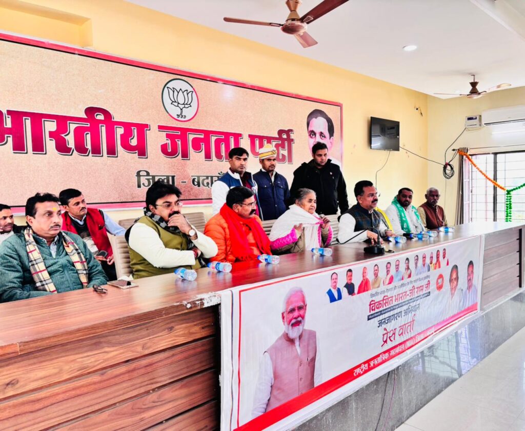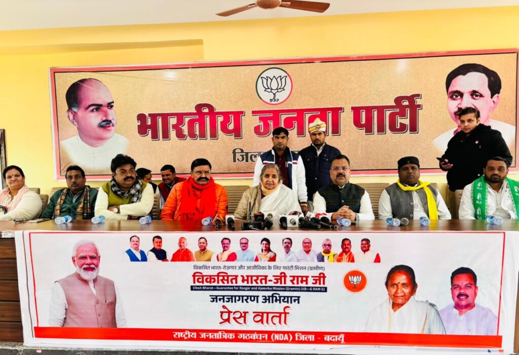 बदायूँ :- भाजपा कार्यालय पर विकसित भारत-गारंटी फॉर रोजगार एवं आजीविका मिशन (ग्रामीण) अधिनियम, 2025 (वीबी-जी-राम-जी) के संबंध में आयोजित प्रेस कॉन्फ्रेंस को राज्यमंत्री (स्वतंत्र प्रभार) माध्यमिक शिक्षा एवं जनपद प्रभारी मंत्री गुलाब देवी ने संबोधित किया।प्रभारी मंत्री गुलाब देवी ने कहा कि एनडीए सरकार ने ग्रामीण श्रमिकों के हितों को सर्वोपरि रखते हुए रोजगार की गारंटी को पहले से अधिक सशक्त, पारदर्शी और प्रभावी बनाया है।उन्होंने कहा कि प्रधानमंत्री नरेंद्र मोदी के नेतृत्व में एनडीए सरकार ग्रामीण भारत को सशक्त बनाने की दिशा में निरंतर कार्य कर रही है। सरकार का लक्ष्य है कि गांव का अंतिम व्यक्ति भी विकास की मुख्यधारा से जुड़े और उसे सम्मानजनक रोजगार तथा स्थायी आजीविका प्राप्त हो।