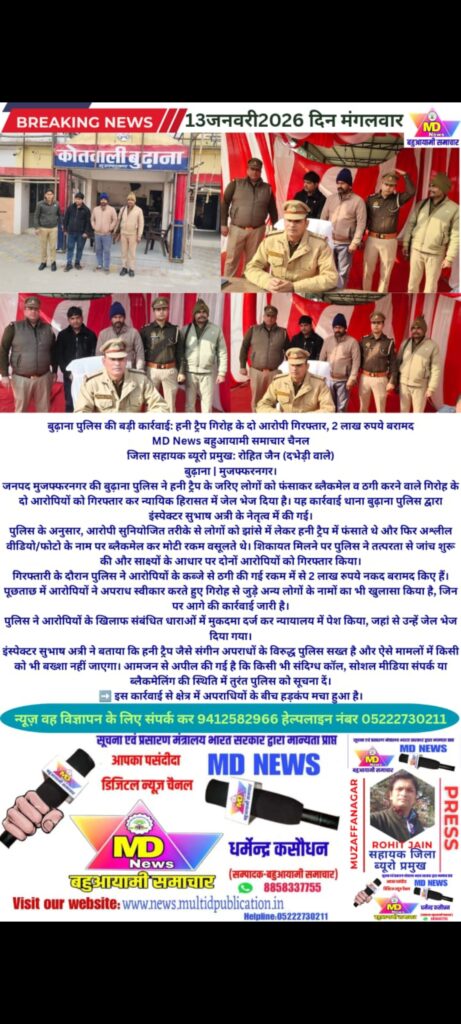 जनपद मुजफ्फरनगर की बुढ़ाना पुलिस ने हनी ट्रैप के जरिए लोगों को फंसाकर ब्लैकमेल व ठगी करने वाले गिरोह के दो आरोपियों को गिरफ्तार कर न्यायिक हिरासत में जेल भेज दिया है। यह कार्रवाई थाना बुढ़ाना पुलिस द्वारा इंस्पेक्टर सुभाष अत्री के नेतृत्व में की गई।