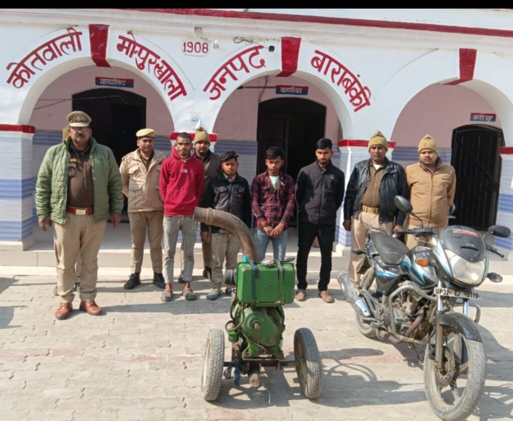 पुलिस अधीक्षक बाराबंकी श्री अर्पित विजयवर्गीय द्वारा जनपद में अपराध एवं अपराधियों पर अंकुश लगाने तथा जनपद में हुई चोरी की घटनाओं का शीघ्र अनावरण करने व अभियुक्तों की गिरफ्तारी हेतु समस्त थाना प्रभारियों को निर्देशित किया गया है। इसी क्रम में आज दिनांक 13.01.2026 को थाना मोहम्मदपुर खाला पुलिस टीम द्वारा 1. मु0अ0सं0-11/2026 धारा 303(2) बीएनएस 2. मु0अ0सं0-12/2026 धारा 303(2) बीएनएस से सम्बन्धित प्रकाश में आये अभियुक्तगण 1. सौरभ उर्फ कृष्णा पुत्र सोनेलाल 2. अनुज कुमार पुत्र राजेश कुमार 3. कुलदीप उर्फ धनपाल पुत्र ईश्वरदीन 4. रोहित उर्फ छोटू विश्वकर्मा पुत्र राकेश कुमार निवासीगण ग्राम शेखूपुर थाना मोहम्मदपुर खाला जनपद बाराबंकी को आल्हेमऊ जंगल के पास से गिरफ्तार किया गया। अभियुक्तगण के कब्जे/निशादेही से चोरी का 1 अदद हाइस्पीड इंजन मय ट्राली बरामद किया गया। चोरी की इंजन की बरामदगी के सम्बन्ध में अभियोग में धारा 317(2) बीएनएस की बढोत्तरी की गयी। घटना में प्रयुक्त एक अदद मोटरसाइकिल को धारा 207 एमवी एक्ट में सीज किया गया।
