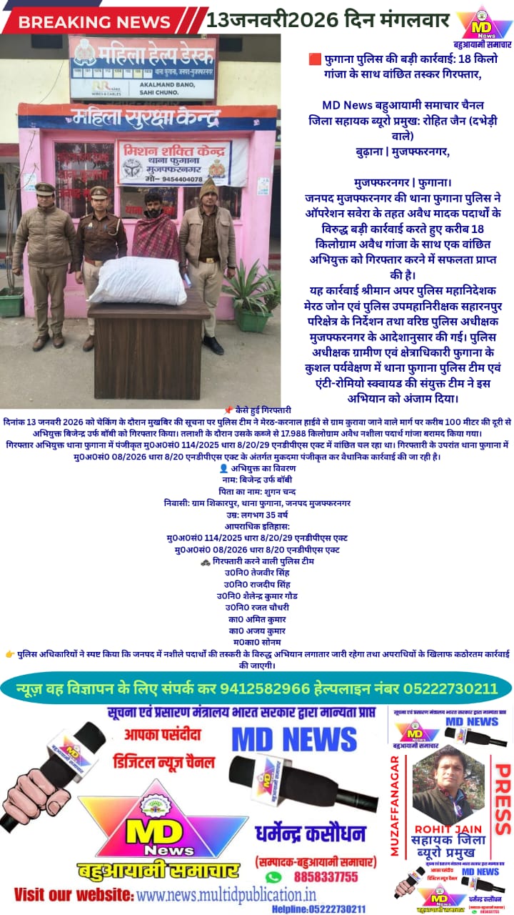 जनपद मुजफ्फरनगर की थाना फुगाना पुलिस ने ऑपरेशन सवेरा के तहत अवैध मादक पदार्थों के विरुद्ध बड़ी कार्रवाई करते हुए करीब 18 किलोग्राम अवैध गांजा के साथ एक वांछित अभियुक्त को गिरफ्तार करने में सफलता प्राप्त की है।