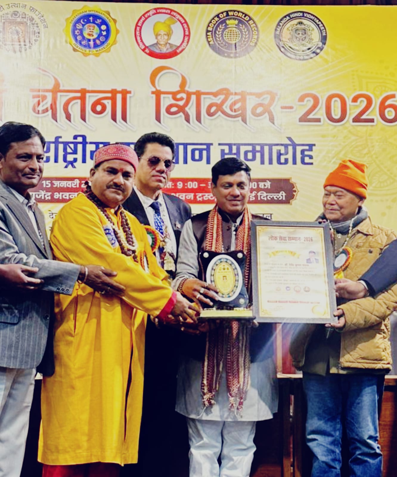 नई दिल्ली। हिंदी, देवनागरी एवं राष्ट्र चेतना के वैश्विक विस्तार को समर्पित “हिंदी चेतना शिखर–2026 : अंतर्राष्ट्रीय सम्मान समारोह” में डॉक्टर देवेंद्र कुमार पाठक को लोक सेवा सम्मान से सम्मानित किया गया देवेंद्र कुमार पाठक को यह सम्मान जनरल सर प्रोफ़ेसर डॉ. जसबीर सिंह / राष्ट्रपति ट्रम्प व्हाइट हाउस सलाहकार संयुक्त राज्य अमरीका आधिकारिक संयुक्त राष्ट्र अध्यक्ष यूनिगो/आईपीएफ़-इन(यूएसए) एवं विशिष्ट अतिथि रसाचार्य डॉ. आई. मेड धर्मयासा (इंडोनेशिया) के कर कमलो द्वारा दिया गया डॉ. देवेंद्र कुमार पाठक को मानवाधिकार, सामाजिक न्याय एवं लोककल्याण के क्षेत्र में उनके उत्कृष्ट जनसेवी योगदान हेतु “लोक सेवा सम्मान” प्रदान किया गया