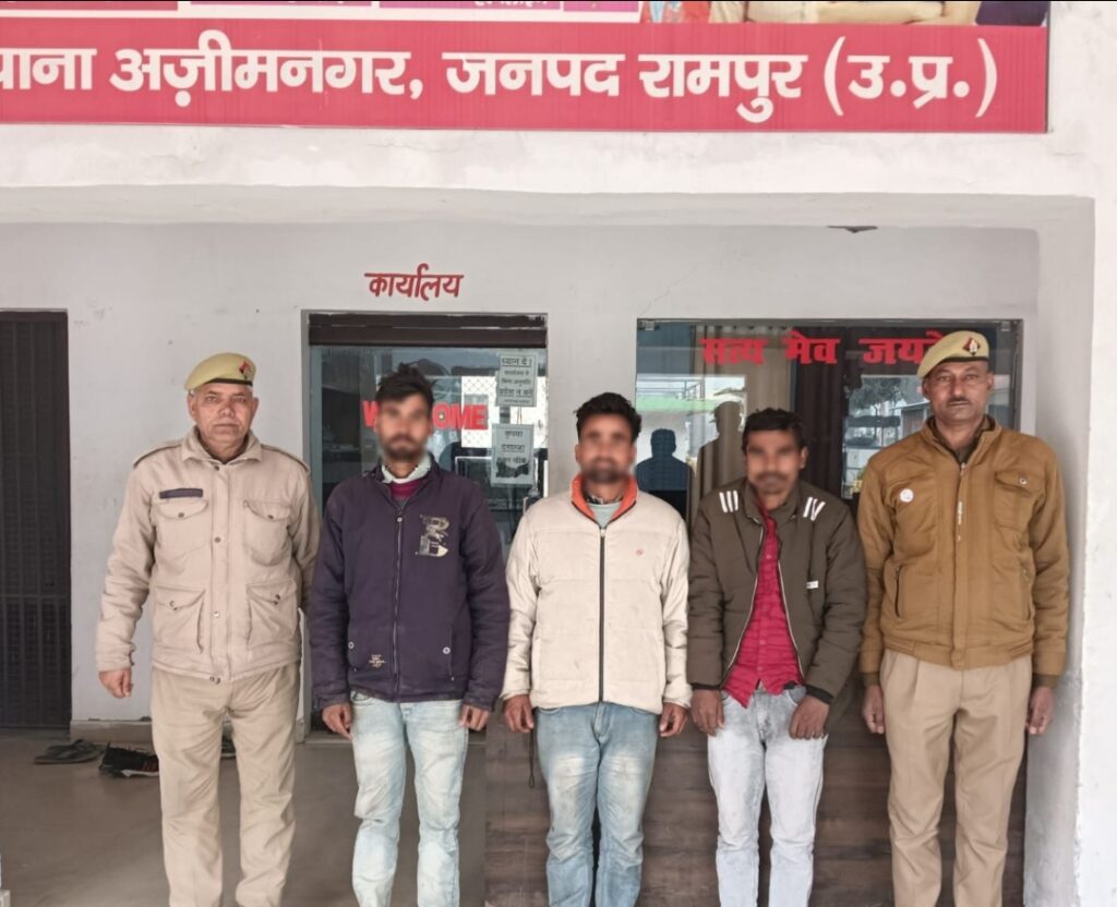 ।आज दिनांक 16.01.2026 को थाना अजीमनगर, रामपुर पुलिस द्वारा 03 नफर वारण्टी 1.संजय सैनी पुत्र अमर सिंह, 2.ओमकार सैनी पुत्र अमर सिंह नि0गण ग्राम इमरता थाना अजीमनगर रामपुर सम्बन्धित वाद सं0- 436/24, मु0अ0स0- 40/24 धारा- 308/ 323/ 324/ 504/ 506 भादवि, 3. कलुआ पुत्र मौ0 अहमद नि0 ग्राम खेमपुर थाना अजीमनगर रामपुर सम्बन्धित वाद सं0- 497/20 मु0अ0स0 36/20 धारा 4/25 आर्म्स एक्ट को उनके मस्कन से गिरफ्तार कर आवश्यक विधिक कार्यवाही की गयी ।