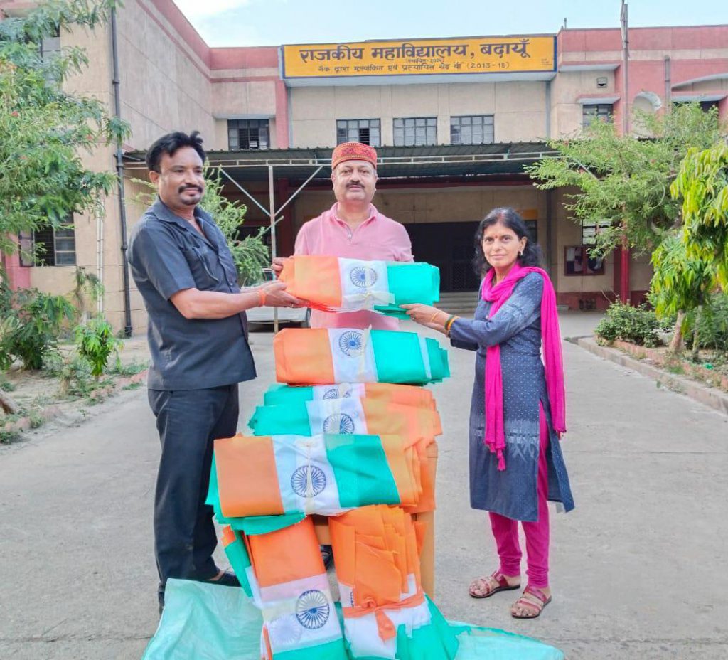 सहसवान : आजादी के अमृत महोत्सव के अंतर्गत स्वतंत्रता दिवस के उपलक्ष में हर घर तिरंगा अभियान में योगदान देते हुए सहसवान स्थित डीपी महाविद्यालय ने अभियान के जनपद प्रभारी एवं राष्ट्रीय सेवा योजना के जिला नोडल अधिकारी डॉ राकेश कुमार जायसवाल को एनएसएस स्वयसेविओं के द्वारा निर्मित तिरंगा प्रदान किया।