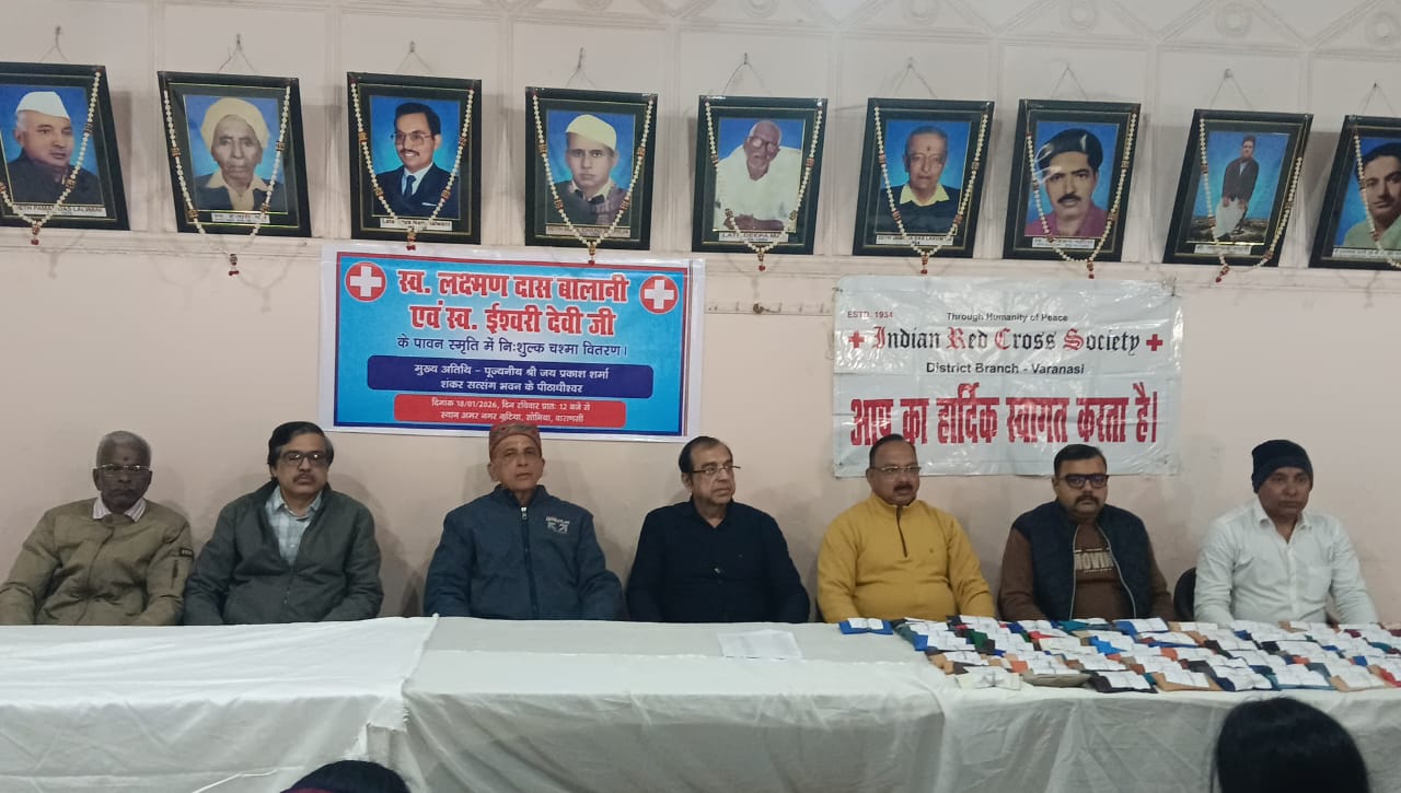 वाराणसी इण्डियन रेडक्रॉस सोसाइटी, वाराणसी एवं सिंधी समाज की विभिन्न संस्थाओं द्वारा आर जे शंकरा आई हॉस्पिटल के सहयोग से निःशुल्क नेत्र परीक्षण शिविर में 204 मरीजों की आँखो की जाच दिनांक 04.01.2026 को हुई थी। जाँच के उपरान्त डाक्टर के द्वारा 102 मरीजों को चश्मा लगाने की सलाह दी गई थी।निःशुल्क नेत्र परीक्षण शिविर के संयोजक जय प्रकाश बालानी के अनुसार 102 मरीजों को निःशुल्क चश्मा वितरण स्व. ईश्वरी देवी एवं स्व. लक्ष्मण दास बालानी जी के पुण्य स्मृति में अमरनगर कुटिया, सोनिया, वाराणसी में दिनांक 18-01-2026 को किया गया। मरीजों का स्वागत रेडक्रॉस सोसाइटी के सचिव डॉ. संजय राय ने किया। कार्यक्रम में मुख्य अतिथि शंकर सत्संग भवन के पीठाधीश्वर जयप्रकाश शर्मां रहे। कार्यक्रम संयोजन में जेपी बालानी,सुरेश तुलस्यान, रोहित बलानी,विजय शाह, चंद्रा बलानी,अजय रूपेजा, कुमार छुगानी, कमलेश छुगानी, पंकज भागचंदानी, यश भागचंदानी, जीतेन्द्र तलरेजा, जीतेन्द्र नैनानी आदि लोगो का भी सहयोग रहा।