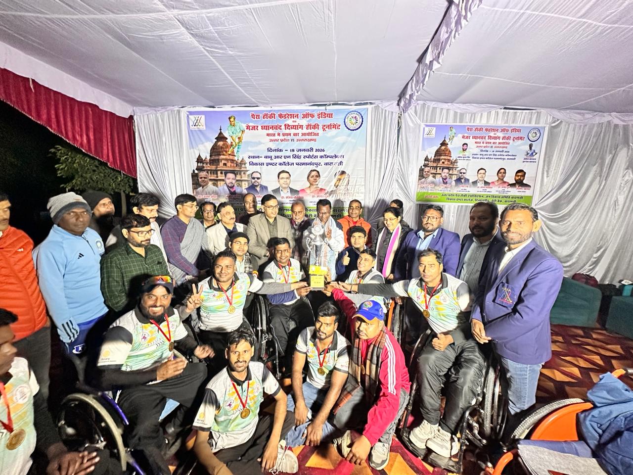 वाराणसी।पैरा हॉकी फेडरेशन ऑफ इंडिया के तत्वावधान में उत्तर प्रदेश पैरा हॉकी एसोसिएशन द्वारा डॉ. मेजर ध्यानचंद दिव्यांग पैरा हॉकी टूर्नामेंट का आयोजन आज दिनांक 18 जनवरी 2026 को वाराणसी स्थित बाबू आर.एन. सिंह स्पोर्ट्स कॉम्प्लेक्स, विकास इंटर कॉलेज, परमानंदपुर में भव्य एवं सफलतापूर्वक संपन्न हुआ। यह टूर्नामेंट उत्तर प्रदेश बनाम उत्तराखण्ड के बीच खेला गया और यह भारत में पहली बार आयोजित होने वाला इस प्रकार का ऐतिहासिक दिव्यांग हॉकी आयोजन रहा। इस विशेष आयोजन के संरक्षक वरिष्ठ खेल प्रशासक अशोक कुमार सिंह रहे, जिनके मार्गदर्शन में कार्यक्रम को नई ऊँचाई मिली।