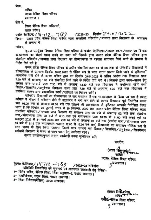 बदायूं : प्रदेश में बेसिक शिक्षा परिषद के कक्षा 1 से 8 तक के परिषदीय व मान्यता प्राप्त प्राथमिक व उच्च प्राथमिक विद्यालय अब सुबह 08 से दोपहर 02 बजे के बीच खुलेंगे। अभी तक विद्यालय सुबह 7.30 से दोपहर 1.30 बजे के बीच खुल रहे थे। बेसिक शिक्षा परिषद के सचिव प्रताप सिंह बघेल के अनुसार यह निर्णय गर्मी कम होने के कारण लिया गया है। अब 30 सितंबर तक सुबह 8 से दोपहर 2 बजे के बीच ही विद्यालय खुलेंगे। इस दौरान प्रार्थना सभा का समय सुबह 8 से 8.15 बजे के बीच व मध्यावकाश का समय सुबह 10.30 से 11 बजे के बीच होगा। बाकी समय में पठन-पाठन व अन्य गतिविधियां होंगी। सितंबर के बाद 1 अक्टूबर 2022 से 31 मार्च 2023 तक विद्यालय का समय सुबह 09 से दोपहर 03 बजे निर्धारित किया गया है ।