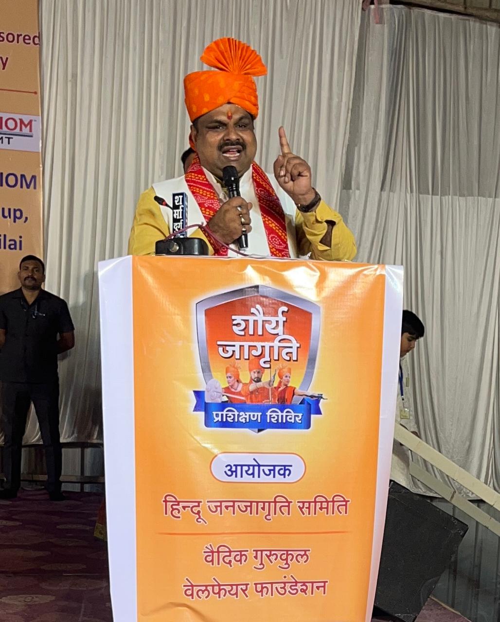 मान्यवर वक्ताओं के क्षात्रतेजयुक्त मार्गदर्शन । श्रीमंत भोसले ने आगे कहा, वैदिक गुरुकुल वेलफेअर फाउंडेशन एवं हिन्दू जनजागृति समिति ने जो शौर्य जागरण का कार्य आरंभ किया है इसे देखकर मुझे विश्वास है कि घर -घर छत्रपति शिवाजी महाराज और झांसी की रानी निश्चित तैयार होंगे | हम इन वीरों की संतानें हैं, इसका हमें सदैव स्मरण रख कर राष्ट्र-धर्म रक्षा हेतु प्रयास करने की आवश्यकता है | शिक्षा मंत्री गजेंद्र यादव ने अपने संबोधन में कहा जिस प्रकार बचपन से ही छत्रपति शिवाजी महाराज को शस्त्र एवं शास्त्र की शिक्षा देकर राजमाता जिजाऊ ने सक्षम बनाया और हिन्दवी स्वराज की नींव रखी, वही शौर्य हर एक युवा में है, केवल उसे जागृत करने की आवश्यकता है, जो इस शिविर के माध्यम से किया जा रहा है | शरीर बलवान करने के साथ मनोबल भी बढ़ाना आवश्यक है और इस जागृत शक्ति का उपयोग धर्मरक्षा के लिए करने से ही हम, हमारा परिवार, समाज और हमारा राष्ट्र सुरक्षित रह पाएंगे |प्रबल प्रताप जूदेव जी ने कहा सनातन की रक्षा हेतु शास्त्र के साथ शस्त्र भी सीखना आवश्यक है | आज सनातन खतरे में है, सनातन को युवाओं की आवश्यकता है | धर्मरक्षा के लिए युवाशक्ति जागृत हो रही है, यह देख आनंद हो रहा है |अलका बागमारजी ने कहा कि हम यदि सप्ताह में से थोडा समय भी इस कार्य में नियमित दें और स्वयं स्वरक्षा सीखकर अन्यों को भी इस कार्य में जोड़ें, तो यह राष्ट्र एवं धर्म रक्षा में हमारा बडा योगदान होगा । दुर्ग शहर के पुलिस अधीक्षक श्री. विजय अग्रवालजी एवं पुलिस उप अधीक्षक भारती मरकामजी ने उपस्थित प्रशिक्षणार्थियों को स्वरक्षा के लिये वर्तमान कानून की जानकारी देते हुये कहा कि यदि आप स्वरक्षा के लिये तैयार हो, तो कानून आपके साथ खड़ा है | आत्मबल बढ़ाने के लिए प्रतिदिन “श्रीराम जय राम जय जय राम” यह जाप करें !- पू. अशोक पात्रीकर सनातन संस्था के संत पू. अशोक पात्रीकरजी ने मार्गदर्शन करते हुए कहा कि धर्म के अनुसार स्त्रियों में दुर्गा तत्व और पुरुषों मे शिव तत्व होता है। जिसे साधना से जागृत करने की आवश्यकता है | इसके आगे हमें अन्याय सहन करना नहीं है, अपितु उसका प्रतिकार करना है | हमें शारीरिक बलोपसना भी साधना के रूप में करनी होगी | और आत्मबल बढ़ाने के लिए प्रतिदिन “श्रीराम जय राम जय जय राम” यह जाप करना होगा | राष्ट्ररक्षा युवाओं का दायित्व है; पहली सीढी स्वरक्षा सीखना ! . सुनील घनवट जिन महान राष्ट्रपुरुषों ने, क्रांतिकारियों ने अपनी युवावस्था से ही स्वयं को राष्ट्र एवं धर्म रक्षा के लिए न्योछावर कर दिया, उनकी शूरता वीरता का अंश हमारे भीतर है, आवश्यकता है उसे जागृत करने की ! हर युवा यदि स्वरक्षा प्रशिक्षण लेकर तैयार हो जाये, तो कोई भी हमारी मां-बहनों को बुरी नजर से देखने 