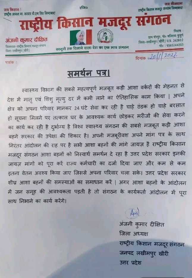 स्वास्थ्य विभाग की सबसे महत्वपूर्ण मजबूत कड़ी इसकी मेहनत से देश में मातृ एवं शिशु मृत्यु दर में कमी लाने का ऐतिहासिक काम किया अपने क्षेत्र को अपना परिवार मानकर 24 घंटे सेवा कर रही है चाहे ठंडक हो चाहे बरसात हो सूचना मिलने का तत्काल घर के आवश्यक कार्य छोड़कर मरीजों की सेवा करने का कार्य कर रही है दुर्भाग्य है विश्व स्वास्थ्य संगठन की सबसे मजबूत कड़ी आशा बहने सरकार की उपेक्षा की शिकार है। अपनी मजबूरी बस अपने मांग पत्र के साथ निरंतर आंदोलन की राह पर है सभी आशा बहनों की मांगे जायज़ है राष्ट्रीय किसान मजदूर संगठन आशा बहनों को निस्वार्थ समर्थन दे रहा है उत्तर प्रदेश सरकार इनकी जायज़ मांगों को पूरा करें राज्य कर्मचारी का दर्जा दिया जाए और कम से कम इतना वेतन अवश्य किया जाए जिससे अपना परिवार चला सके। उत्तर प्रदेश सरकार शीघ्र आशा बहनों की समस्याओं का समाधान करें अगर आशा बहनों के आंदोलन में जन समूह की आवश्यकता पड़ती है तो संगठन के कार्यकर्ता आंदोलन में पूरा साथ निभाना का कार्य करेंगे। अंजनी कुमार दीक्षित जिला अध्यक्ष राष्ट्रीय किसान मजदूर संगठन जनपद लखीमपुर खीरी उत्तर प्रदेश