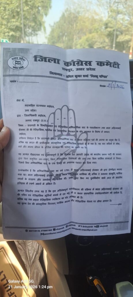 * एचडी न्यूज़ बहुआयामी समाचार न्यूज़ चैनल जिला रिपोर्टर यूसुफ की रिपोर्टप्रदर्शन को संबोधित करते हुए पूर्व विधायक श्री संजय कपूर जी ने कहा—“मणिकर्णिका घाट केवल ईंट-पत्थरों की संरचना नहीं, बल्कि भारत की आत्मा, सनातन संस्कृति और मोक्ष परंपरा का जीवंत प्रतीक है। भाजपा सरकार द्वारा बिना जन-संवाद, बिना इतिहासकारों और धर्माचार्यों से परामर्श किए किया गया ध्वस्तीकरण, सीधा-सीधा हमारी आस्था और सांस्कृतिक विरासत पर हमला है। माता अहिल्याबाई होलकर जैसी महान शासिका की स्मृतियों और उनके द्वारा संरक्षित धरोहर का अपमान किसी भी स्थिति में स्वीकार्य नहीं है। कांग्रेस इस अन्याय के विरुद्ध सड़क से सदन तक संघर्ष करेगी।”इस अवसर पर कांग्रेस कार्यकर्ताओं ने बड़ी संख्या में एकत्र होकर “भाजपा हटाओ – धर्म बचाओ”, “विरासत से खिलवाड़ बंद करो” जैसे नारे लगाए तथा महामहिम राज्यपाल, उत्तर प्रदेश के नाम संबोधित ज्ञापन जिलाधिकारी महोदय, रामपुर को सौंपा।जिला कांग्रेस कमेटी के अध्यक्ष श्री निक्कू पंडित ने कहा कि मणिकर्णिका घाट सनातन धर्म, मोक्ष परंपरा और भारत की प्राचीन सांस्कृतिक चेतना का केंद्र है। बिना विशेषज्ञों की राय और धार्मिक संस्थाओं से विचार-विमर्श किए किया गया यह कृत्य अत्यंत असंवेदनशील, अलोकतांत्रिक और निंदनीय है।शहर कांग्रेस कमेटी के अध्यक्ष श्री बाकर अली खां ने कहा कि भाजपा सरकार के “विरासत संरक्षण” के दावे केवल दिखावा हैं। अगर विकास के नाम पर इतिहास और आस्था को कुचला जाएगा, तो कांग्रेस इसका हर स्तर पर विरोध करेगी।प्रदर्शन के उपरांत सौंपे गए ज्ञापन में कांग्रेस ने उच्चस्तरीय न्यायिक जांच, दोषियों पर कठोर कार्रवाई, मणिकर्णिका घाट के मूल ऐतिहासिक स्वरूप में पुनर्निर्माण तथा माता अहिल्याबाई होलकर जी की मूर्ति की सम्मानपूर्वक पुनः स्थापना की मांग की।इस कार्यक्रम में प्रमुख रूप से जिला उपाध्यक्ष साहिर रज़ा खां, कार्यालय सचिव शकील मंसूरी, एस.के. अग्रवाल, सोशल मीडिया प्रभारी नोमान मुमताज खान, नरेगा बचाओ कार्यक्रम के कोऑर्डिनेटर दुर्गेश मौर्य, सेवादल अध्यक्ष चितरंजन प्रसाद, शहर उपाध्यक्ष शारीव अली खां, जमील मियां, युवा कांग्रेस जिलाध्यक्ष आरिफ अल्वी, मोहम्मद ज़की, चमरौब्बा ब्लॉक अध्यक्ष राजेश कुमार लोधी, भूरा खां, जिवेन्द्र गंगवार, कपिल चौधरी, कौशल सक्सेना, राजीव आर्य, बद्री प्रसाद मौर्य, सरदार गुरवाज़ सिंह, मोहम्मद रफी, मोसिन अंसारी, मोहम्मद इरफान, मोइन पठान सहित बड़ी संख्या में कांग्रेस कार्यकर्ता उपस्थित रहे।कांग्रेस ने स्पष्ट किया कि ऐतिहासिक विरासत और धार्मिक आस्था की रक्षा के लिए यह आंदोलन लोकतांत्रिक तरीके से लगातार जारी रहेगा।जिला कांग्रेस कमेटी, रामपुरशहर