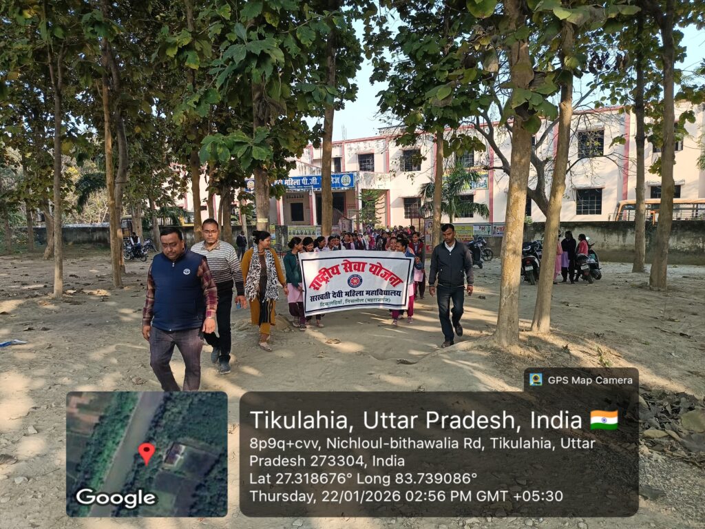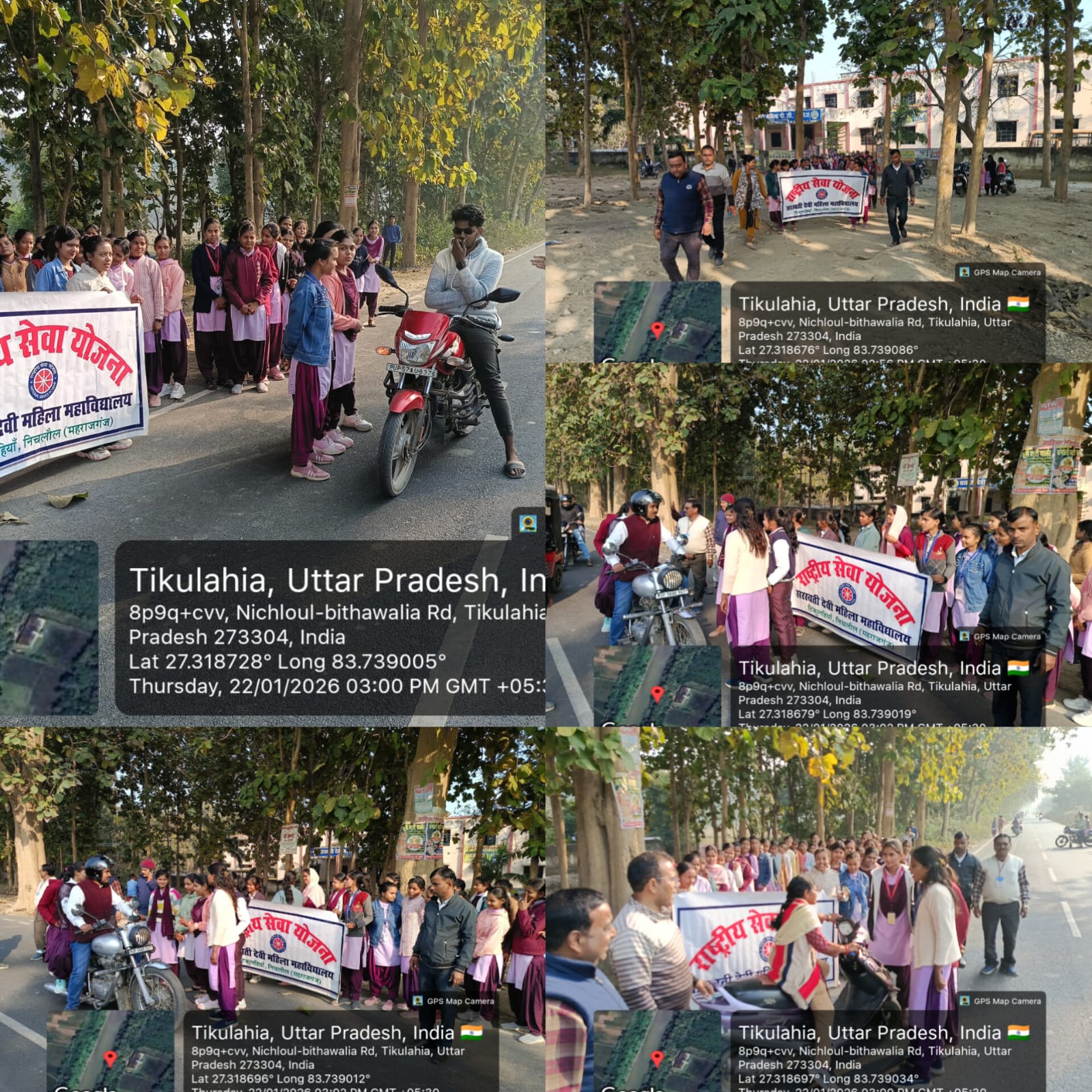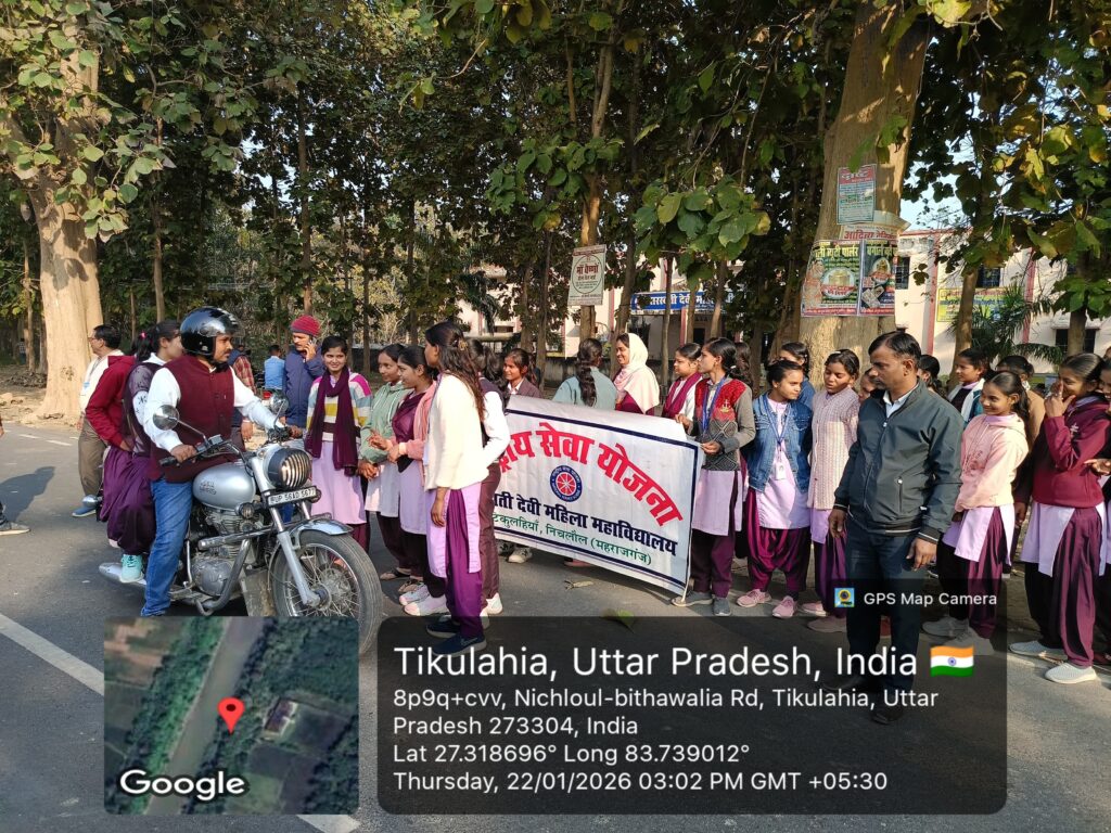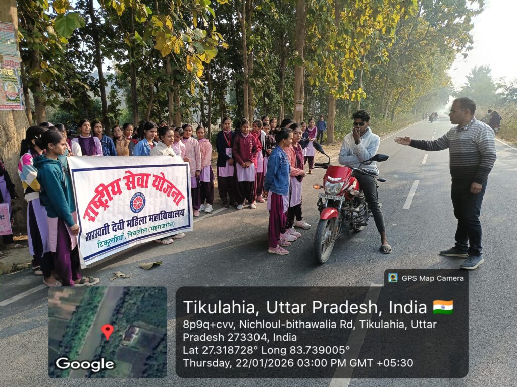 महराजगंज। दिनांक 22/01/2026 को सरस्वती देवी महिला महाविद्यालय टिकुलहिया निचलौल महराजगंज में राष्ट्रीय सेवा योजना के अंतर्गत रानी लक्ष्मी बाई इकाई द्वारा सड़क सुरक्षा जीवन रक्षा अभियान जागरुकता रैली निकाली गई।
