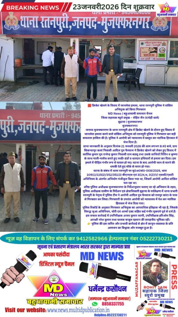 जनपद मुजफ्फरनगर के थाना रतनपुरी क्षेत्र में क्रिकेट खेलने के दौरान हुए विवाद में जानलेवा हमला करने वाले वांछित अभियुक्त को रतनपुरी पुलिस ने गिरफ्तार कर बड़ी सफलता हासिल की है। पुलिस ने आरोपी को न्यायालय में प्रस्तुत कर न्यायिक हिरासत में भेज दिया है।