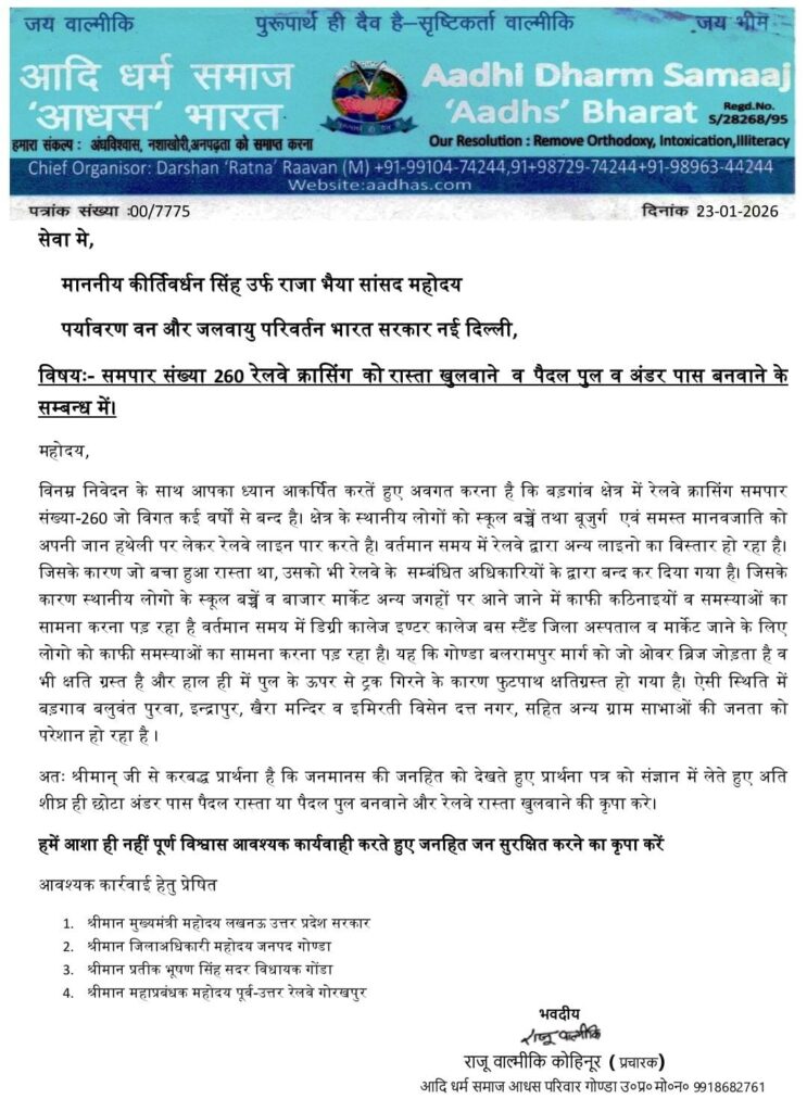 बिग ब्रेकिंग न्यूज़ गोण्डा एमडी न्यूज ब्यूरो गोंडा -अजीत कुमार यादव राजू वाल्मीकि कोहिनूर प्रचारक( आदि धर्म समाज आधस परिवार गोण्डा उप्र.) ने दिया मांग पत्र गोण्डा- रेल प्रशासन द्वारा जबरन रास्ता बन्द कर दिया गया है जिसको लेकर माननीय प्रधानमंत्री और माननीय मुख्यमंत्री व रेल महाप्रबंधक व सांसद व विधायक महोदय को एक प्रार्थना मांग पत्र लिखकर बड़गांव ब्रिज समपार संख्या 260 रेलवे क्रासिंग को खुलवाने व पैदल पुल व अंडर पास बनवाने के सम्बन्ध में। खबर उत्तरप्रदेश के गोंडा जिले से है राजू वाल्मीकि कोहिनूर प्रचारक( आदि धर्म समाज आधस परिवार गोण्डा उप्र.) ने हमारे संवाददातासे बताया कि उन्होंने अपने मांग पत्र में बच्चों बुजुर्गों के साथ-साथ क्षेत्र के स्थानीय लोगों को एवं समस्त मानव जाति को अपनी जान हथेली पर लेकर रेलवे लाइन पार करते है।, वर्तमान समय में रेलवे द्वारा अन्य लाइनों का विस्तार हो रहा है जिसके कारण जो बचा हुआ रास्ता था । उसको भी रेलवे क संबंधित अधिकारियों द्वारा बंद कर दिया गया। जिसके कारण स्थानीय लोगों के स्कूल बच्चे , बाजार अन्य जगहों पर आने-जाने में काफी कठिनाइयो व समस्याओं का सामना करना पड़ रहा है, वर्तमान समय में डिग्री कॉलेज ,इंटर कॉलेज ,बस स्टैंड ,जिला अस्पताल व बाजार जाने के लिए लोगों को काफी समस्याओं का सामना करना पड़ रहा है,ये ओवरब्रिज गोंडा- बलरामपुर मार्ग को जोड़ता है। वह भी क्षतिग्रस्त है ,और हाल ही में ओवर ब्रिज के ऊपर से ट्रक गिरने के कारण फुटपाथ क्षतिग्रस्त हो गया था।ऐसी स्थिति में बड़गांव,बलवंत पुरवा, इन्द्रापुर, खैरा मंदिर व इमरती विसेन,दत्त नगर सहित अन्य ग्राम सभाओं के लोगो को परेशानी का सामना करना पड़ता है
