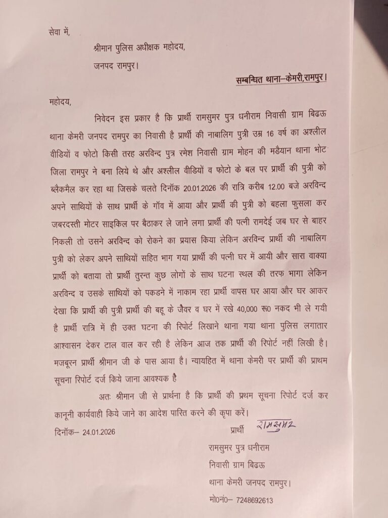 एमडी न्यूज़ बहुआयामी समाचार न्यूज़ चैनल सहायक ब्यूरो चीफ रफीउल्लाह खान । तुरैहा मछुआ समाज के जिला अध्यक्ष कमल कुमार तुरैहा के नेतृत्व पुलिस अधीक्षक कार्यालय पहुंचकर पुत्री के बारामदगी की मांग को लेकर मिला। और बताया कि 20 जनवरी को बहला फुसलाकर ले गया और केमरी थाने की पुलिस की रिपोर्ट तक नहीं लिख रही। और उसका पिता राम सुमर निवासी ग्राम विढ ऊ थाना केमरी तहसील बिलासपुर भटक रहा है। पुत्री को ले जाने वाला अरविंद पुत्र रमेश निवासी मोहन की मोहन की मड़ैया थाना भोट तहसील सदर जिला रामपुर है। इस मौके पर जिला अध्यक्ष कमल कुमार तुरैहा, महामंत्री राम सिंह तुरैहा एडवोकेट, पूर्व जिला अध्यक्ष डा कृपाल सिंह तुरैहा, राजपाल सिंह, कमल कुमार मुन्ना, विनोद कुमार तुरैश्ररहा, अनिल कुमार, राजेश कुमार अरविंद कुमार, अर्जुन कुमार, मुरारीलाल, अजय कुमार, राधेश्याम, रवि कुमार, राहुल सिंह आदि मौजूद रहे।