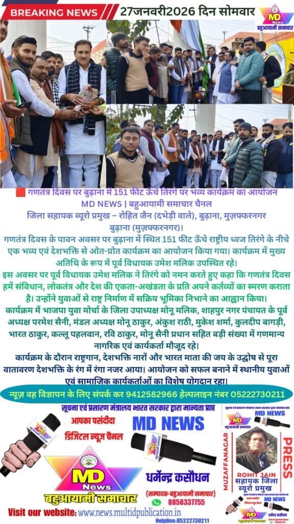 MD NEWS | बहुआयामी समाचार चैनलजिला सहायक ब्यूरो प्रमुख–रोहित जैन (दभेड़ी वाले) बुढ़ाना मुज़फ्फरनगरबुढ़ाना (मुज़फ्फरनगर)।गणतंत्र दिवस के पावन अवसर पर बुढ़ाना में स्थित 151 फीट ऊँचे राष्ट्रीय ध्वज तिरंगे के नीचे एक भव्य एवं देशभक्ति से ओत-प्रोत कार्यक्रम का आयोजन किया गया। कार्यक्रम में मुख्य अतिथि के रूप में पूर्व विधायक उमेश मलिक उपस्थित रहे।इस अवसर पर पूर्व विधायक उमेश मलिक ने तिरंगे को नमन करते हुए कहा कि गणतंत्र दिवस हमें संविधान, लोकतंत्र और देश की एकता-अखंडता के प्रति अपने कर्तव्यों का स्मरण कराता है। उन्होंने युवाओं से राष्ट्र निर्माण में सक्रिय भूमिका निभाने का आह्वान किया।कार्यक्रम में भाजपा युवा मोर्चा के जिला उपाध्यक्ष मोनू मलिक, शाहपुर नगर पंचायत के पूर्व अध्यक्ष परमेश सैनी, मंडल अध्यक्ष मोनू ठाकुर, अंकुश राठी, मुकेश शर्मा, कुलदीप बागड़ी, भारत ठाकुर, कल्लू पहलवान, रवि ठाकुर, मोनू सैनी प्रधान सहित बड़ी संख्या में गणमान्य नागरिक एवं कार्यकर्ता मौजूद रहे।कार्यक्रम के दौरान राष्ट्रगान, देशभक्ति नारों और भारत माता की जय के उद्घोष से पूरा वातावरण देशभक्ति के रंग में रंगा नजर आया। आयोजन को सफल बनाने में स्थानीय युवाओं एवं सामाजिक कार्यकर्ताओं का विशेष योगदान रहा।
