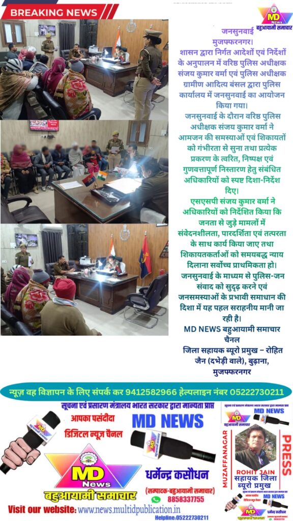 जनसुनवाई के दौरान वरिष्ठ पुलिस अधीक्षक संजय कुमार वर्मा ने आमजन की समस्याओं एवं शिकायतों को गंभीरता से सुना तथा प्रत्येक प्रकरण के त्वरित, निष्पक्ष एवं गुणवत्तापूर्ण निस्तारण हेतु संबंधित अधिकारियों को स्पष्ट दिशा-निर्देश दिए।एसएसपी संजय कुमार वर्मा ने अधिकारियों को निर्देशित किया कि जनता से जुड़े मामलों में संवेदनशीलता, पारदर्शिता एवं तत्परता के साथ कार्य किया जाए तथा शिकायतकर्ताओं को समयबद्ध न्याय दिलाना सर्वोच्च प्राथमिकता हो।जनसुनवाई के माध्यम से पुलिस-जन संवाद को सुदृढ़ करने एवं जनसमस्याओं के प्रभावी समाधान की दिशा में यह पहल सराहनीय मानी जा रही है।MD NEWS बहुआयामी समाचार चैनलजिला सहायक ब्यूरो प्रमुख – रोहित जैन (दभेड़ी वाले), बुढ़ाना, मुजफ्फरनगर