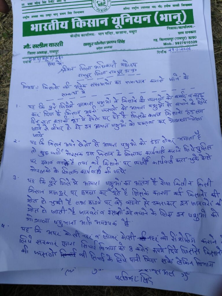 *बिलासपुर तहसील में भाकियू (भानू) का जोरदार प्रदर्शन, किसानों की समस्याओं को लेकर छह सूत्री ज्ञापन सौंपा* एमडी न्यूज़ बहुआयामी समाचार न्यूज़ चैनल सहायक ब्यूरो चीफ रफीउल्लाह खान की रिपोर्टरामपुर आज दिनांक 29 जनवरी 2026 को भारतीय किसान यूनियन (भानू) के कार्यकर्ता और पदाधिकारी अपने पूर्व निर्धारित कार्यक्रम के तहत रामपुर कलेक्ट्रेट परिसर स्थित पार्क में एकत्र हुए। यहां किसानों की ज्वलंत समस्याओं पर विचार-विमर्श के बाद जिलाधिकारी के नाम छह सूत्री ज्ञापन लेकर किसान नारेबाजी करते हुए जिला अध्यक्ष मोहम्मद सलीम वारसी के नेतृत्व में जिलाधिकारी कार्यालय के सामने पहुंचे और जोरदार प्रदर्शन किया। किसानों की आवाज सुनकर सिटी मजिस्ट्रेट स्वयं मौके पर पहुंचे और किसानों से सीधे संवाद किया। उन्होंने किसानों की समस्याएं गंभीरता से सुनीं और शीघ्र समाधान का आश्वासन दिया। इस पर किसानों ने ज्ञापन सौंपा। इस दौरान जिला अध्यक्ष मोहम्मद सलीम वारसी ने कहा कि पूर्व में भी कई बार ज्ञापन दिए जा चुके हैं, लेकिन उन पर कोई ठोस कार्रवाई नहीं हुई, जिससे किसानों में भारी रोष व्याप्त है। उन्होंने स्पष्ट कहा कि यदि इस बार भी समस्याओं का समाधान नहीं हुआ, तो आंदोलन को और तेज किया जाएगा।किसानों को संबोधित करते हुए उन्होंने आरोप लगाया कि तहसील में तैनात लेखपाल और कानूनगो खुलेआम किसानों से वसूली कर रहे हैं और बिना रिश्वत के कोई काम नहीं किया जा रहा। अधिकारियों की चुप्पी से यह प्रतीत होता है कि सब कुछ उनकी सहमति से हो रहा है। उन्होंने आवारा पशुओं की समस्या को गंभीर बताते हुए कहा कि पूरे क्षेत्र में इनका आतंक है। आए दिन आवारा पशुओं के हमले से लोगों की जान जा रही है और हाईवे पर वाहनों से टकराकर पशुओं की भी मौत हो रही है। किसानों की फसलें लगातार नष्ट हो रही हैं, जिससे किसान रात-दिन ठंड में खेतों पर पहरा देने को मजबूर हैं। उन्होंने मांग की कि सभी आवारा पशुओं को तत्काल गौशालाओं में भेजा जाए। साथ ही आरोप लगाया कि यदि किसान डंडा लेकर पशुओं को भगाता है, तो फर्जी गौरक्षक उसके खिलाफ थाने में कार्रवाई कराने पहुंच जाते हैं। ऐसे फर्जी गौरक्षकों पर सख्त कार्रवाई की मांग की गई।जिला अध्यक्ष ने वन विभाग पर भी गंभीर आरोप लगाए। सिंचाई विभाग पर आरोप लगाते हुए उन्होंने कहा कि नहरों की सफाई के लिए सरकार द्वारा आवंटित धन का दुरुपयोग किया गया है। मानक के अनुसार सफाई नहीं कराई गई और ठेकेदारों से मिलकर धन का बंदरबांट किया गया। कई नहरों, माइनरों और गूलों पर अवैध कब्जे करा दिए गए हैं। यह की अपार कोसी नहर व लोअर कोसी नहर के लिए रिमोल्डिंग करने के लिए सरकार द्वारा सिंचाई विभाग को 8 करोड रुपए दिए जिससे किसानों की फसलों की सिंचाई के लिए पानी 