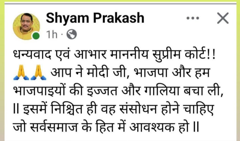 “#हरदोई:-सियासत में आमतौर पर नेता अपनी ही सरकार के फैसलों पर या तो चुप्पी साध लेते हैं या खुलकर बचाव करते हैं, लेकिन हरदोई के गोपामऊ से भाजपा विधायक श्याम प्रकाश ने इस परंपरा से हटकर बयान देकर राजनीतिक हलकों में हलचल मचा दी है।विश्वविद्यालय अनुदान आयोग (UGC) के नए नियमों पर सुप्रीम कोर्ट द्वारा रोक लगाए जाने के बाद विधायक श्याम प्रकाश की प्रतिक्रिया अब सोशल मीडिया पर तेजी से वायरल हो रही है। उन्होंने कोर्ट के फैसले का स्वागत करते हुए बेहद बेबाक अंदाज में कहा कि “कोर्ट ने भाजपा और हम कार्यकर्ताओं की इज्जत और गालियां दोनों बचा लीं।”विधायक श्याम प्रकाश ने सोशल मीडिया पर लिखा—> “धन्यवाद एवं आभार माननीय सुप्रीम कोर्ट। आपने मोदी जी, भाजपा और हम भाजपाइयों की इज्जत और गालियां बचा लीं।”दरअसल, UGC के नए नियमों को लेकर छात्रों और समाज के बड़े वर्ग में भारी नाराजगी देखने को मिल रही थी। विधायक का साफ कहना है कि शिक्षा जैसे संवेदनशील विषय पर नियम किसी एक वर्ग के लिए नहीं, बल्कि सर्वसमाज के हित में होने चाहिए।उनकी यह स्वीकारोक्ति यह भी दर्शाती है कि वे ज़मीनी हकीकत और जनता की भावना को भली-भांति समझते हैं।विधायक के इस बयान के बाद सोशल मीडिया पर प्रतिक्रियाओं की बाढ़ आ गई है। एक ओर लोग सुप्रीम कोर्ट के फैसले को शिक्षा व्यवस्था के हित में बता रहे हैं, तो वहीं दूसरी ओर श्याम प्रकाश की स्पष्टवादिता और बेबाकी की जमकर सराहना हो रही है। समर्थकों का कहना है कि एक जनप्रतिनिधि का असली धर्म यही है कि वह पार्टी लाइन से ऊपर उठकर जनहित की बात करे।कुल मिलाकर, विधायक श्याम प्रकाश का यह बयान यह साबित करता है कि कभी-कभी सच बोलना ही सबसे बड़ी राजनीति होती है, और जनता को यही सच्चाई सबसे ज्यादा पसंद आती है।#UGC #UGCविरोध #viralreelschallenge #viralphotochallenge #viralvideochallenge #viralreelschallenge2025viralreelschallengejaiviralreelschallengeviralreelschallenge #nonfollowersviewersfollowersシ゚viralfollowersシ゚ #nonfollowersviewers #up #Update#shyamprakash