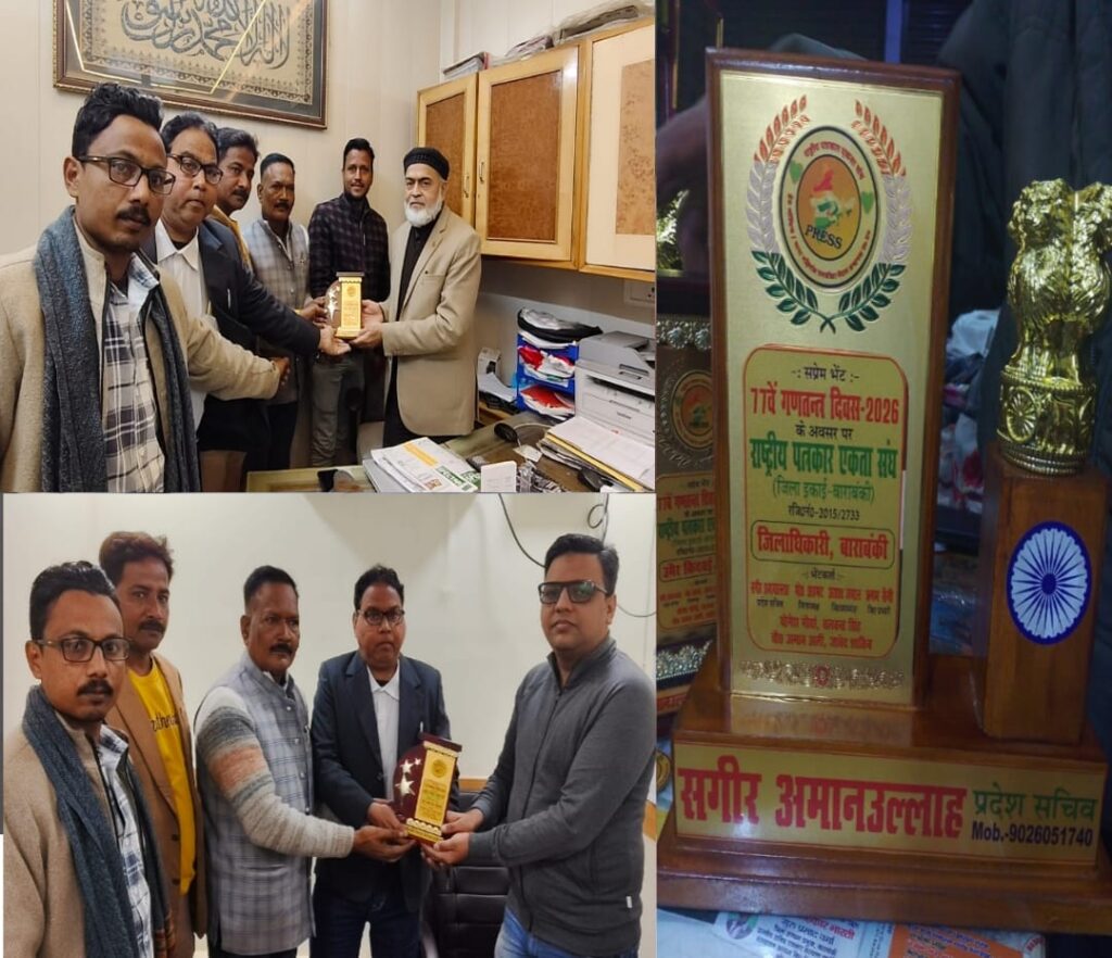 मो. उमर किदवई और डॉ. फर्रुख को समाज व स्वास्थ्य क्षेत्र में उत्कृष्ट योगदान के लिए मिला सम्मान*बाराबंकी। राष्ट्रीय पत्रकार एकता संघ की जिला इकाई द्वारा जनपद में निस्वार्थ भाव से समाजसेवा करने वाले दो प्रमुख व्यक्तियों को सम्मानित किया गया। संगठन का उद्देश्य समाज में सकारात्मक बदलाव लाने वाले व्यक्तियों को प्रोत्साहित कर उन्हें प्रेरणा स्रोत बनाना है, ताकि अन्य लोग भी समाजहित में आगे आएं।इस अवसर पर वरिष्ठ समाजसेवी मो. उमर किदवई तथा स्वास्थ्य सेवाओं में उत्कृष्ट योगदान देने वाले डॉ. फर्रुख (डायरेक्टर, नेशनल क्रिटिकेयर एंड डायलिसिस सेंटर) को सम्मानित किया गया।मो. उमर किदवई वर्ष 1990 से सेवा सोसाइटी के अध्यक्ष रह चुके हैं। वे जनपद की ईदगाह कमेटी में 15 वर्षों तक अध्यक्ष पद पर रहे तथा खुमार मेमोरियल एकेडमी में जनरल सेक्रेटरी के रूप में सेवाएं दे चुके हैं। उन्होंने बाढ़ आपदा के दौरान प्रभावितों की सहायता की, कोरोना काल में कोरोना वारियर की भूमिका निभाई और वक्फ बोर्ड के डिजिटाइजेशन के दौरान वक्फ वालंटियर के रूप में जनपदवासियों की मदद की। उनके प्रयासों से बाराबंकी जिला उत्तर प्रदेश में उम्मीद पोर्टल पर वक्फ संबंधी कार्यों में प्रथम स्थान पर रहा।इसी क्रम में डॉ. फर्रुख को स्वास्थ्य क्षेत्र में बेहतर सेवाओं और समाजसेवा के लिए सम्मानित किया गया।इसके अतिरिक्त, संगठन के पदाधिकारियों ने तेजतर्रार जिलाधिकारी शशांक त्रिपाठी से, जिन्हें हाल ही में SIR में उत्कृष्ट कार्य के लिए सम्मानित किया गया था, तथा पुलिस अधीक्षक अर्पित विजयवर्गीय से, जिन्हें गणतंत्र दिवस पर शौर्य का रजत पदक प्रदान किया गया, मुलाकात कर उन्हें बधाई एवं शुभकामनाएं दीं।कार्यक्रम में जिलाध्यक्ष मोहम्मद अहमद, जिला उपाध्यक्ष अरशद जमाल, जिला प्रभारी ऋषभ सैनी, जिला मीडिया प्रभारी उस्मान चौधरी और प्रदेश सचिव सगीर अमानउल्लाह सहित संगठन के अन्य पदाधिकारी उपस्थित रहे।ऐसे सम्मान समारोह समाज में सेवा भावना को बढ़ावा देने और सकारात्मक परिवर्तन लाने में अहम भूमिका निभाते हैं।रिपोर्ट मंडल ब्यूरो चीफ अयोध्या तेज बहादुर शर्मा।