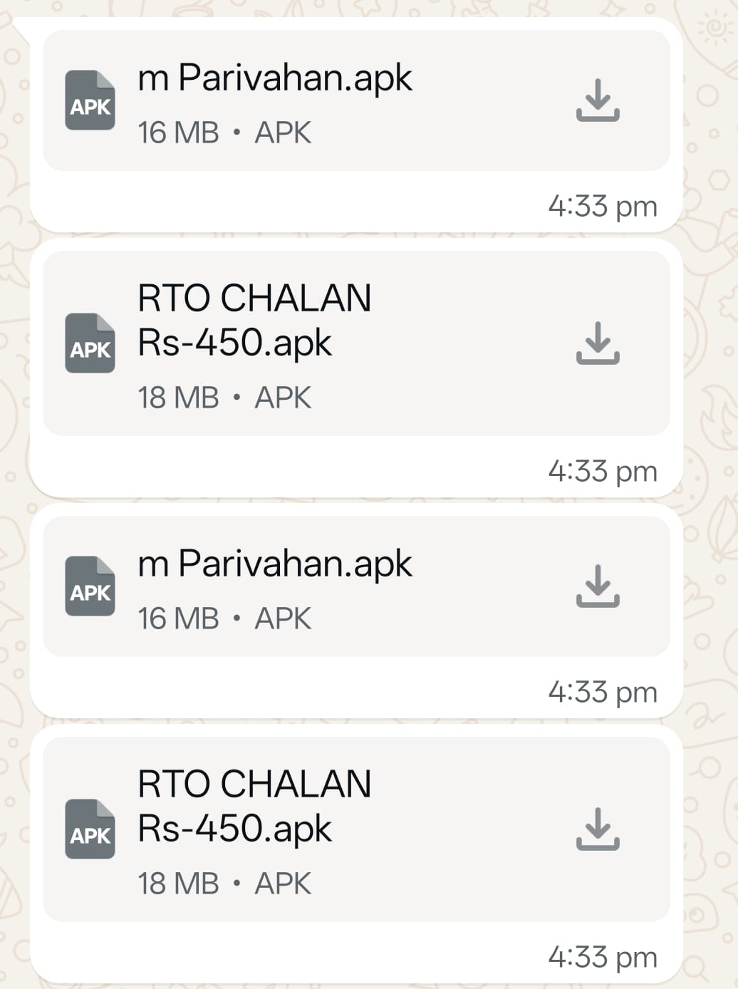 जानकारी के अनुसार एपीके फाइलों को किसी प्रतिष्ठित संस्थान, विभाग या संस्था के मान पर भेजा जा रहा है। इसमें एपीके फाइल का नाम भी किसी बैंक, सरकारी विभाग और बीमा कंपनियों के नाम पर रखा जा रहा। उदाहरण के तौर पर आरटीओ कार्यालय के नाम पर व्हाट्सएप पर चालान के संदेश भेजे जा रहे। इसमें चालान पढ़ते ही लोग जल्दबाजी में उसे डाउनलोड कर रहे। अनजाने में डाउनलोड की गई फाइल को खोलते ही फोन हैक हो रहे हैं।