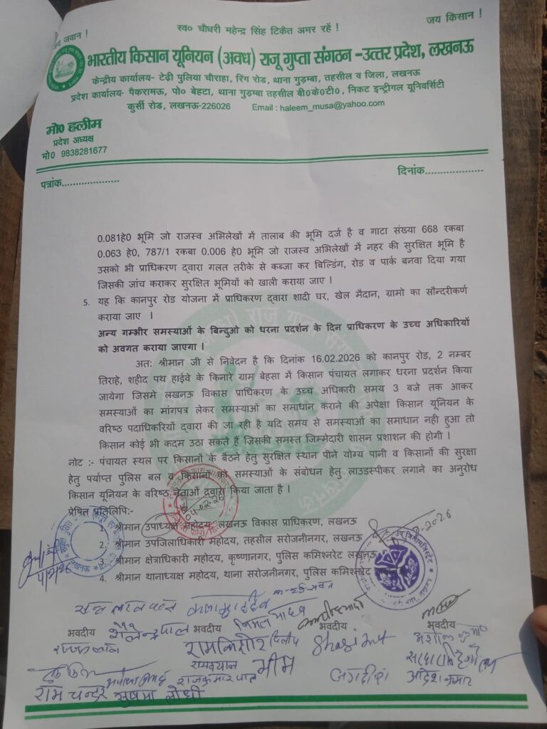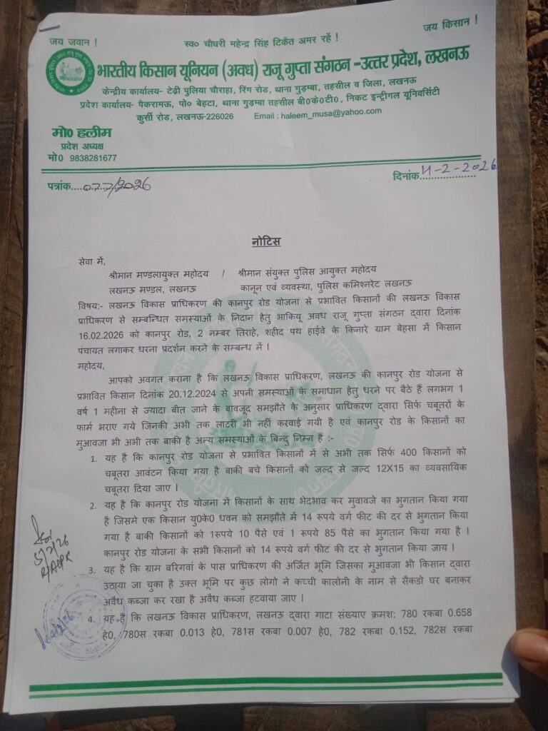 दिनांक 6 2 2026 को अवध विहार योजना के सभी सम्मानित पदाधिकारीगण शहीद पथ के किनारे ग्राम हरिहर पुर डिप्टी गंज धरना स्थल पर बैठक होगी जिसमें सभी साथियों की उपस्थिति अनिवार्य है