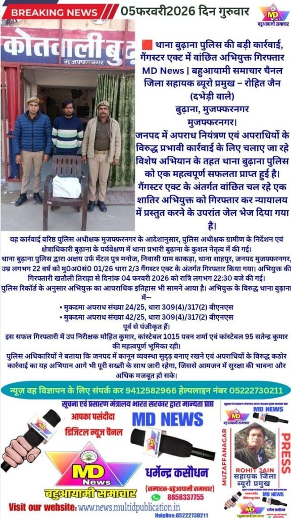 थाना बुढ़ाना पुलिस द्वारा अक्षय उर्फ मेंटल पुत्र मनोज, निवासी ग्राम काकड़ा, थाना शाहपुर, जनपद मुजफ्फरनगर, उम्र लगभग 22 वर्ष को मु0अ0सं0 01/26 धारा 2/3 गैंगस्टर एक्ट के अंतर्गत गिरफ्तार किया गया। अभियुक्त की गिरफ्तारी खतौली तिराहा से दिनांक 04 फरवरी 2026 को रात्रि लगभग 22:30 बजे की गई।