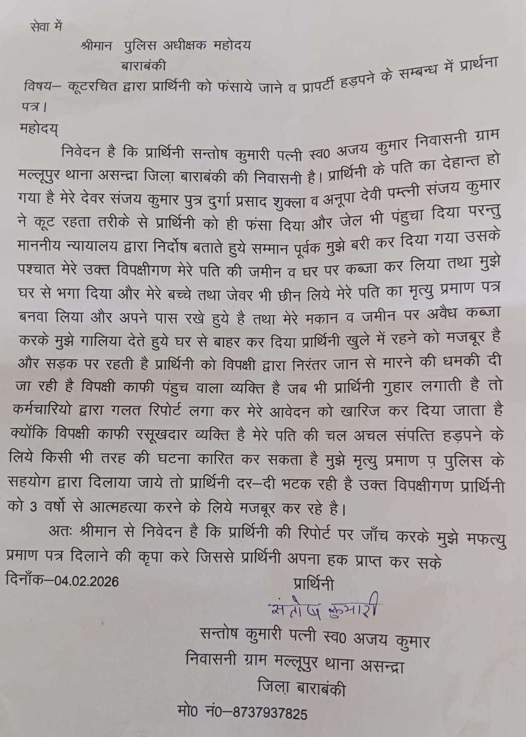मेरे पति का मृत्यु प्रमाण पत्र बनवा लिया और अपने पास रखे हुये है तथा मेरे मकान व जमीन पर अवैध कब्जा करके मुझे गालिया देते हुये घर से बाहर कर दिया संतोष कुमारी खुले में रहने को मजबूर है और सड़क पर रहती है संतोष कुमारी को विपक्षी द्वारा निरंतर जान से मारने की धमकी दी जा रही है विपक्षी काफी पंहुच वाला व्यक्ति है कर्मचारियो द्वारा गलत रिपोर्ट लगा कर मेरे आवेदन को खारिज कर दिया जाता है क्योंकि विपक्षी काफी रसूखदार व्यक्ति है मेरे पति की चल अचल संपत्ति हड़पने के लिये किसी भी तरह की घटना कारित कर सकता है मुझे मृत्यु प्रमाण पत्र पुलिस के सहयोग द्वारा दिलाया जाये तो संतोष कुमारी दर-दर भटक रही है उक्त विपक्षीगण द्वारा संतोष कुमारी को 3 वर्षों से आत्महत्या करने के लिये मजबूर कर दिया एक तरफ योगी सरकार महिलाओं के लिए सुरक्षा सम्मान दे रही है दूसरी तरफ पीड़ित सवर्ण महिला न्याय के लिए उच्च अधिकारियों के चक्कर लगा रही है खबर प्रकाशित होने के बाद देखना है कि पीड़िता को न्याय मिलता है कि नहीं ।
