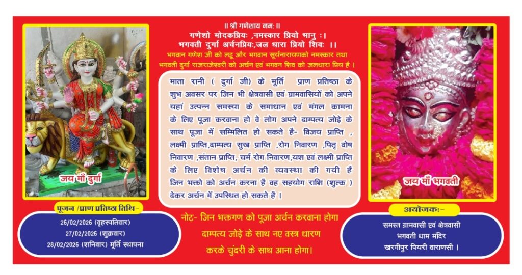 वाराणसी खरगीपुर पियरी में दुर्गा माता की मूर्ति की प्राण प्रतिष्ठा का आयोजन भव्य शोभायात्रा, वैदिक मंत्रोच्चार, हवन और भंडारे के साथ धूमधाम से किया जाएगा। मूर्तियों को दूध, दही, शहद, घी और चीनी से स्नान कराकर विशेष अनुष्ठान द्वारा स्थापित किया जाता है। इस पावन अवसर पर कलश यात्रा का आयोजन और भक्तों की भारी भीड़ जुटने की संभावना है।दुर्गा माता की मूर्ति की प्राण प्रतिष्ठा एक अत्यंत शुभ और पवित्र अनुष्ठान है, जो पूरी आस्था, विधि-विधान और धूमधाम से संपन्न होगा। इस आयोजन में भव्य कलश यात्रा, वैदिक मंत्रोच्चार, पूजा-अर्चना और विशेष आरती के साथ माता की प्रतिमा को जागृत किया जाएगा। यह कार्यक्रम साहस, आस्था और शक्ति के प्रतीक के रूप में बुराई पर अच्छाई की विजय का संदेश देगा , माता रानी (दुर्गा जी) के मूर्ति प्राण प्रतिष्ठा के शुभ अवसर पर जिन भी क्षेत्रवासी एवं ग्रामवासियों को अपने यहां उत्पन्न समस्या के समाधान एवं मंगल कामना के लिए पूजा करवाना हो वे लोग अपने दाम्पत्य जोड़े के साथ पूजा में सम्मिलित हो सकते है- विजय प्राप्ति, लक्ष्मी प्राप्ति, दाम्पत्य सुख प्राप्ति रोग निवारण, पितृ दोष निवारण, संतान प्राप्ति, चर्म रोग निवारण, यश एवं लक्ष्मी प्राप्ति के लिए विशेष अर्चन की व्यवस्था की गयी है जिन भक्तो को अर्चन करना है वह सहयोग राशि (शुल्क ) देकर अर्चन में उपस्थित हो सकते है। जिन भक्तगण को पूजा अर्चन करवाना होगा दाम्पत्य जोड़े के साथ नए वस्त्र धारण करके चुंदरी के साथ आना होगा। वहीं इस अनुष्ठान के बारे में जानकारी देते हुए मंदिर के पुजारी पंडित सचिदानंद मिश्रा ने बताया कि यह अनुष्ठान माता रानी के प्रेरणा और आशीर्वाद से हो रहा है। वहीं पंकज सिंह का कहना है कि यह कार्यक्रम समस्त क्षेत्रवासियों एवं ग्राम वासियों के सहयोग से कराया जा रहा है इसमें लोग तन मन धन से बढ़ चढ़ कर हिस्सा ले रहे हैं यह हम लोगों लिए सौभाग्य एवं गर्व की बात है।