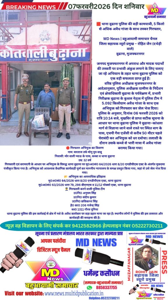 ,MD News | बहुआयामी समाचार चैनलजिला सहायक ब्यूरो प्रमुख – रोहित जैन (दभेड़ी वाले)बुढाना, मुजफ्फरनगरजनपद मुजफ्फरनगर में अपराध और मादक पदार्थों की तस्करी पर प्रभावी अंकुश लगाने के लिए चलाए जा रहे अभियान के तहत थाना बुढाना पुलिस को एक बड़ी सफलता प्राप्त हुई है।वरिष्ठ पुलिस अधीक्षक मुजफ्फरनगर के आदेशानुसार, पुलिस अधीक्षक ग्रामीण के निर्देशन एवं क्षेत्राधिकारी बुढाना के पर्यवेक्षण में, प्रभारी निरीक्षक बुढाना के कुशल नेतृत्व में पुलिस टीम ने 5.092 किलोग्राम अवैध गांजा के साथ एक अभियुक्त को गिरफ्तार कर जेल भेज दिया।पुलिस के अनुसार, दिनांक 06 फरवरी 2026 को रात्रि 10:14 बजे, मुखबिर से प्राप्त सटीक सूचना के आधार पर थाना बुढाना पुलिस ने बुढाना–कांधला मार्ग से विज्ञाना जाने वाले रास्ते पर स्थित बाग के पास, एचपी गैस एजेंसी से करीब 50 मीटर पहले घेराबंदी कर अभियुक्त को धर दबोचा। तलाशी के दौरान उसके कब्जे से भारी मात्रा में अवैध गांजा बरामद किया गया।गिरफ्तार अभियुक्त का विवरणनाम: सरताज उर्फ मोनू पुत्र बाबूनिवासी: मोर वाली प्याऊ के पास, कस्बा व थाना बुढानाउम्र: 32 वर्षगिरफ्तारी एवं बरामदगी के आधार पर अभियुक्त के विरुद्ध थाना बुढाना पर मु0अ0सं0 64/2026 धारा 8/20 एनडीपीएस एक्ट के अंतर्गत मुकदमा पंजीकृत किया गया है। अभियुक्त को आवश्यक वैधानिक कार्यवाही पूर्ण कर माननीय न्यायालय के समक्ष प्रस्तुत किया गया, जहां से उसे जेल भेज दिया गया।अभियुक्त का आपराधिक इतिहासमु0अ0सं0 64/2026 धारा 8/20 एनडीपीएस एक्ट, थाना बुढानामु0अ0सं0 63/2026 धारा 79, 296 बीएनएस व 11/12 पोक्सो एक्ट, थाना बुढानागिरफ्तारी करने वाली पुलिस टीमउ0नि0 अनुपम सिंहउ0नि0 संदीप कुमारउ0नि0 छविकान्त सिंहहै0 का0 206 गजेन्द्र सिंहका0 1311 गौरव पूनियाथाना बुढाना पुलिस की इस कार्रवाई से क्षेत्र में नशे के अवैध कारोबार पर बड़ा प्रहार माना जा रहा है। स्थानीय लोगों ने पुलिस की इस तत्परता और कार्यवाही की सराहना की है।