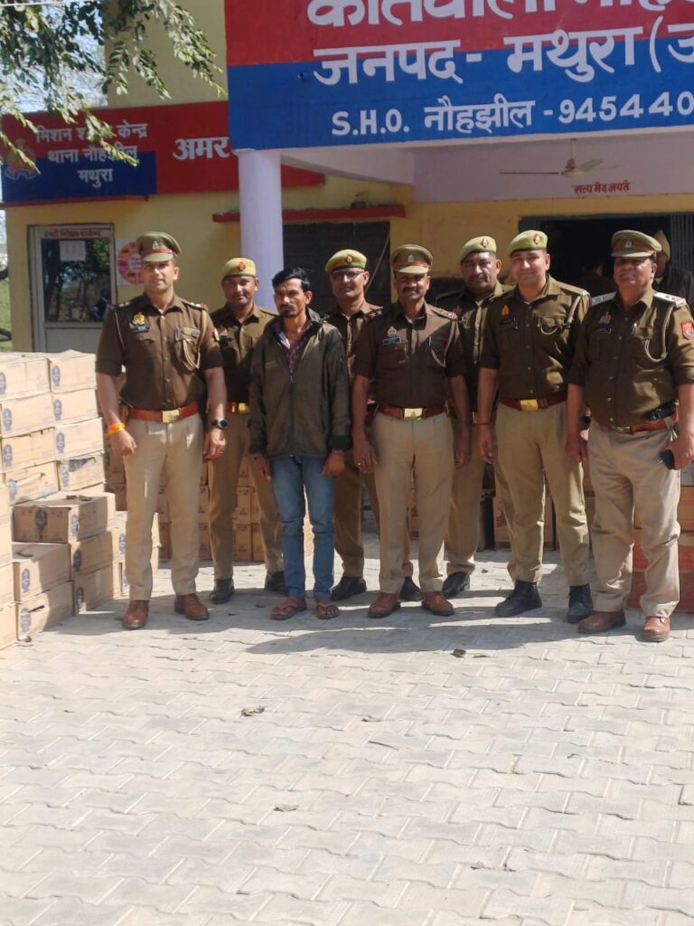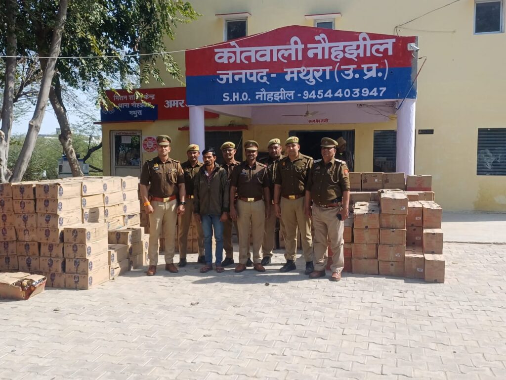 जनपद मथुरा के थाना नौहझील क्षेत्र के अंतर्गत गोमत -नौहझील रोड पर बाजना कट के पास एक मामला सामने आया है जिसमें 8 फरवरी को सुबह 2:40 बजे शराब से भरा ट्रक थाना नौहझील की टीम द्वारा पकड़ा गया । बताया गया है कि ट्रक की संख्या BR 28 GA 2655 है जिसमें 403 पेटी अंग्रेजी शराब की पाई गई हैं और ट्रक के साथ एक व्यक्ति जिसका नाम अखाराम पुत्र हेमाराम है जो कि थाना जिला गोदामली (राजस्थान) का निवासी है इसे भी थाना नौहझील की टीम द्वारा गिरफ्तार किया गया है।