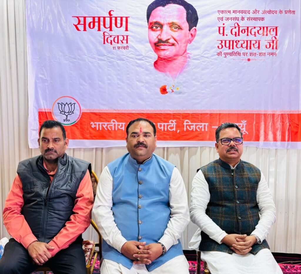 बदायूँ :- बदायूँ स्थित राजमहल गार्डन में भाजपा एवं जनसंघ के प्रमुख विचारक, एकात्म मानववाद और अंत्योदय के प्रणेता पंडित दीनदयाल उपाध्याय की पुण्यतिथि पर ‘समर्पण दिवस’ के रूप में आयोजित कार्यक्रम में उनके चित्र पर पुष्पांजलि अर्पित कर भावपूर्ण श्रद्धांजलि दी तथा तीन सत्रों के माध्यम से पंडित दीनदयाल उपाध्याय के विचारों, दर्शन एवं अंत्योदय के संकल्प पर मुख्य अतिथि पूर्व डीसीबी चैयरमैन भूपेंद्र सिंह, जिलाध्यक्ष राजीव कुमार गुप्ता, जिला प्रवक्ता शैलेन्द्र मोहन शर्मा ने अपने विचार साझा किए।”संगठन मूल्य, प्रधानमंत्री नरेंद्र मोदी द्वारा अंत्योदय की दिशा में किए जा रहे प्रयासों पर” जिलाध्यक्ष राजीव कुमार गुप्ता ने कहा कि पंडित दीनदयाल उपाध्याय का सपना था कि समाज का सबसे कमजोर व्यक्ति भी विकास की मुख्यधारा से जुड़े।