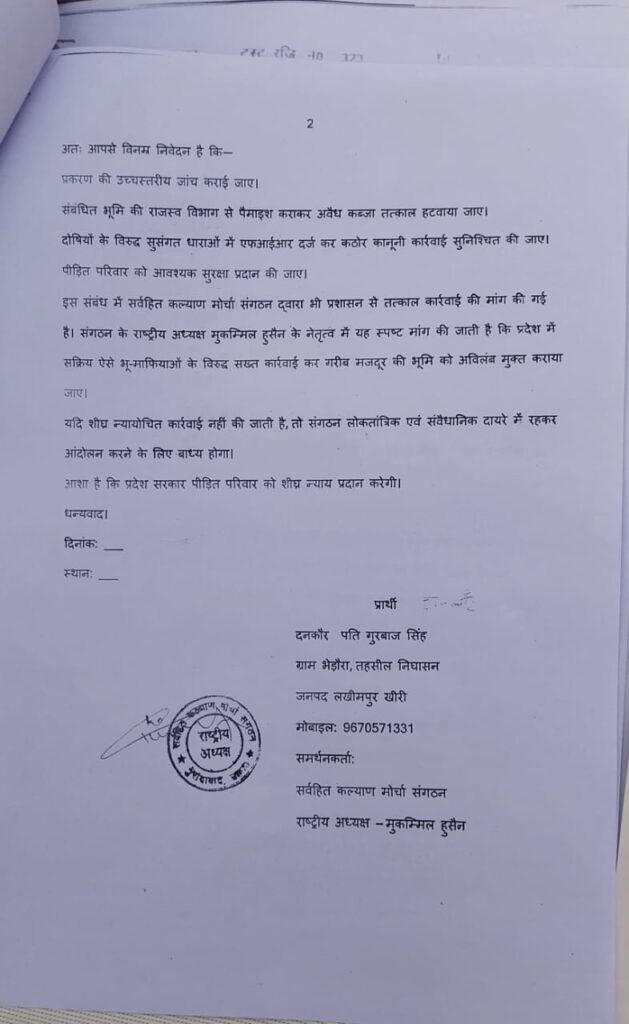 ज्ञापन में गाटा संख्या 760 दान कौर पत्नी गुरबाज सिंह, गाटा संख्या 763 नारद पुत्र जवाहर, कमलेश पुत्र पुत्तू, प्रकाश पुत्र बेचई निवासी ग्राम चिरकुआ पोस्ट सिंगाही, जनपद लखीमपुर खीरी सहित अन्य पट्टेदारों के नाम शामिल हैं।