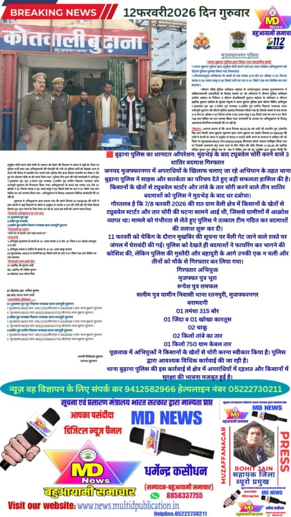 जनपद मुजफ्फरनगर में अपराधियों के खिलाफ चलाए जा रहे अभियान के तहत थाना बुढ़ाना पुलिस ने साहस और सतर्कता का परिचय देते हुए बड़ी सफलता हासिल की है। किसानों के खेतों से ट्यूबवेल स्टार्टर और तांबे के तार चोरी करने वाले तीन शातिर बदमाशों को पुलिस ने मुठभेड़ के बाद धर दबोचा।