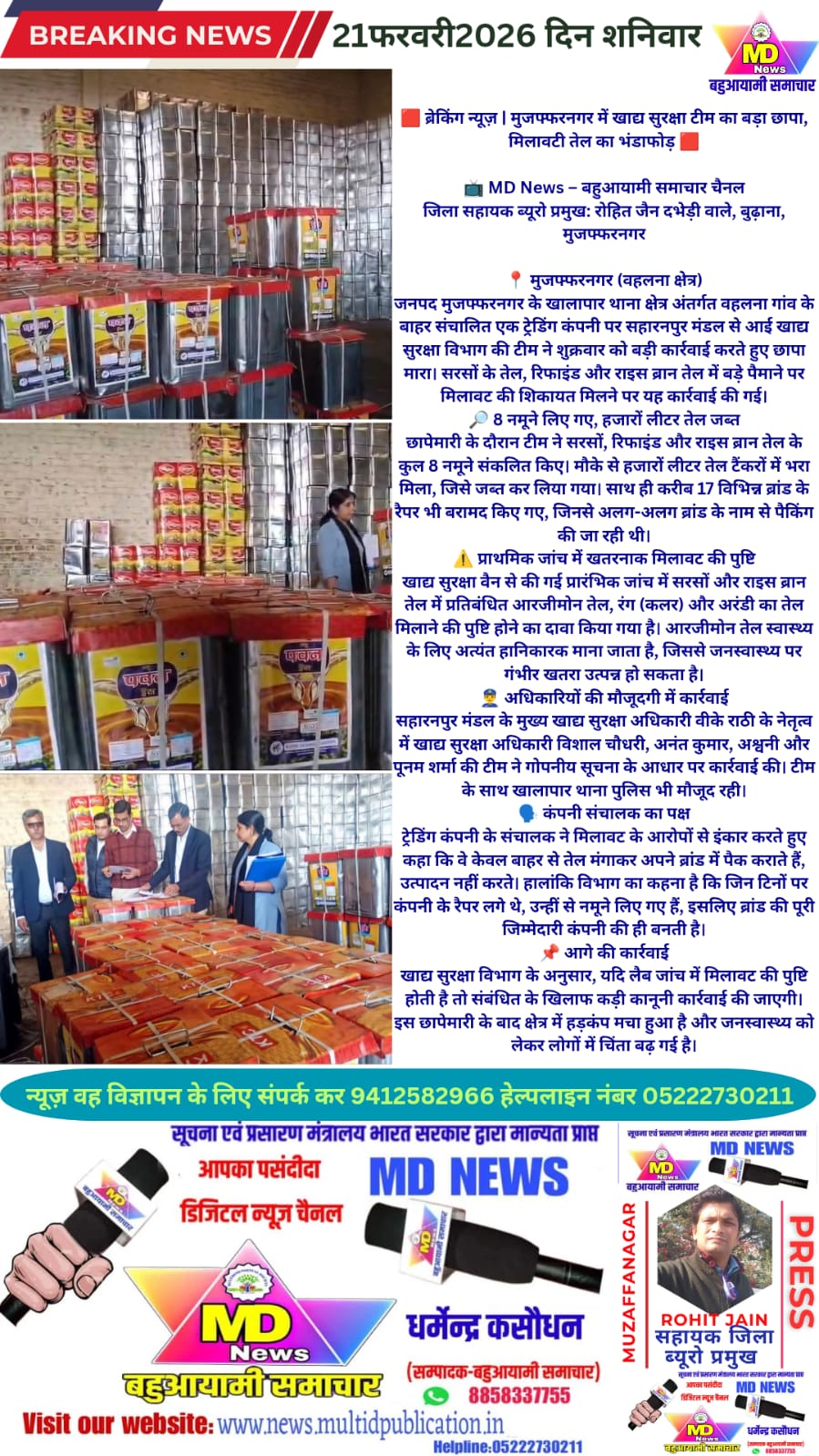 जनपद मुजफ्फरनगर के खालापार थाना क्षेत्र अंतर्गत वहलना गांव के बाहर संचालित एक ट्रेडिंग कंपनी पर सहारनपुर मंडल से आई खाद्य सुरक्षा विभाग की टीम ने शुक्रवार को बड़ी कार्रवाई करते हुए छापा मारा। सरसों के तेल, रिफाइंड और राइस ब्रान तेल में बड़े पैमाने पर मिलावट की शिकायत मिलने पर यह कार्रवाई की गई।