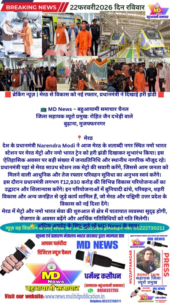 MD News – बहुआयामी समाचार चैनल जिला सहायक ब्यूरो प्रमुख: रोहित जैन दभेड़ी वालेबुढ़ाना, मुजफ्फरनगरमेरठदेश के प्रधानमंत्री Narendra Modi ने आज मेरठ के शताब्दी नगर स्थित नमो भारत स्टेशन पर मेरठ मेट्रो और नमो भारत ट्रेन को हरी झंडी दिखाकर शुभारंभ किया। इस ऐतिहासिक अवसर पर बड़ी संख्या में जनप्रतिनिधि और स्थानीय नागरिक मौजूद रहे।प्रधानमंत्री यहां से मेरठ साउथ स्टेशन तक मेट्रो की सवारी करेंगे, जिससे आम जनता को मिलने वाली आधुनिक और तेज रफ्तार परिवहन सुविधा का अनुभव स्वयं करेंगे।इस दौरान प्रधानमंत्री लगभग ₹12,930 करोड़ की विभिन्न विकास परियोजनाओं का उद्घाटन और शिलान्यास करेंगे। इन परियोजनाओं में बुनियादी ढांचे, परिवहन, शहरी विकास और अन्य जनहित से जुड़े कार्य शामिल हैं, जो मेरठ और पश्चिमी उत्तर प्रदेश के विकास को नई दिशा देंगे।मेरठ में मेट्रो और नमो भारत सेवा की शुरुआत से क्षेत्र में यातायात व्यवस्था सुदृढ़ होगी, रोजगार के अवसर बढ़ेंगे और आर्थिक गतिविधियों को गति मिलेगी।अधिक अपडेट के लिए जुड़े रहें MD News के साथ।