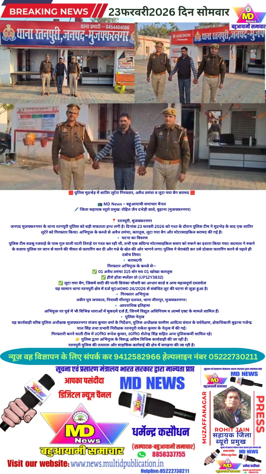 जनपद मुजफ्फरनगर के थाना रतनपुरी पुलिस को बड़ी सफलता हाथ लगी है। दिनांक 23 फरवरी 2026 को गश्त के दौरान पुलिस टीम ने मुठभेड़ के बाद एक शातिर लुटेरे को गिरफ्तार किया। अभियुक्त के कब्जे से अवैध तमंचा, कारतूस, लूटा गया बैग और मोटरसाइकिल बरामद की गई है।