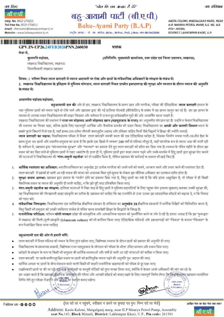 बहुआयामी दल की ओर से हम, लखनऊ विश्वविद्यालय के सजग छात्र और नागरिक, परिसर की ऐतिहासिक लाल बारादरी इमारत के पास मुस्लिम छात्रों को नमाज पढ़ने से रोके जाने और प्रशासन द्वारा की गई हालिया घेराबंदी (बैरिकेडिंग) के संबंध में यह ज्ञापन प्रस्तुत कर रहे हैं। हम इस ज्ञापन के माध्यम से आपका ध्यान विश्वविद्यालय की साझा विरासत और वर्तमान में उत्पन्न हुए संवेदनशील मुद्दों की ओर आकर्षित करना चाहते हैं: