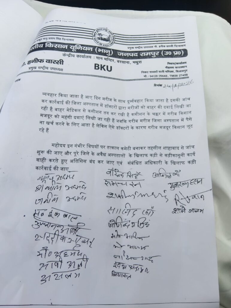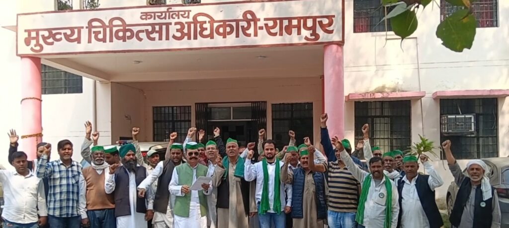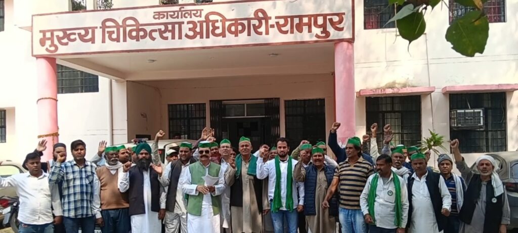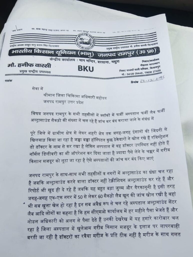आज दिनांक 24 फरवरी को भारतीय किसान यूनियन भानू की सैकड़ो पदाधिकारी जिला अस्पताल सीमा कार्यालय पहुंचे जिले भर में चल रहे फर्जी अस्पताल फर्जी अल्ट्रासाउंड सेंटर फर्जी लेवल और जिला अस्पताल में अल्ट्रासाउंड सीटी स्कैन और एक के नाम पर गरीब किसान मजदूर से लिए जा रही रिश्वत का मुद्दा उठाया और जोरदार नारेबाजी के साथ प्रदर्शन किया इस मौके पर प्रमुख राष्ट्रीय उपाध्यक्ष मोहम्मद हनीफ वारसी ने कहा कि जनपद रामपुर में किसी भी किसान मजदूर एवं व्यापारी या किसी की जान से खिलवाड़ नहीं होने दी जाएगी जो लोग स्वास्थ्य के नाम पर धंधा चल रहे हैं वह अपना बोरिया बिस्तर बंद कर ले अन्यथा बाकी बहुत बड़ा आंदोलन करेगी जो अधिकारी फर्जी अस्पताल चलवा रहे हैं उनके खिलाफ बहुत जल्दी मोर्चा खोला जाएगा प्रदर्शन के दौरान शोर सराव सुनकर जिला चिकित्सा अधिकारी सीएमओ भारतीय किसान यूनियन के सभी पदाधिकारी से आग्रह किया कि आप समस्याएं दिन हम कार्रवाई करेंगे और दोबारा आपको शिकायत नहीं मिलेगी कई सूत्री ज्ञापन सौंप कर चेतावनी के साथ एक माह के अंदर फर्जी वाला बंद करने की चेतावनी दी जिला अस्पताल में अच्छी सुविधा और सरकारी जो अस्पताल में सभी तहसीलों में नगरों में उनमें अच्छी सुविधा गरीब किसान को देने की मांग रखी पर दर्शन करने वालों को ज्ञापन देने वालों में मुराद खान मुबारक रफत खान अखिल खान हड़ताल सिंह यादव सतनाम सिंह मोहम्मद अहमद आरिफ अली मतलब हुसैन गुड्डू लियाकत खान शकील अहमद शकील खान पहलवान शाने आलम धर्मपाल सिंह रणजीत सिंह राजा बाबू गुफरान अली रिजवान अली मुकेश कुमार सोनू दीपक आदि शामिल है