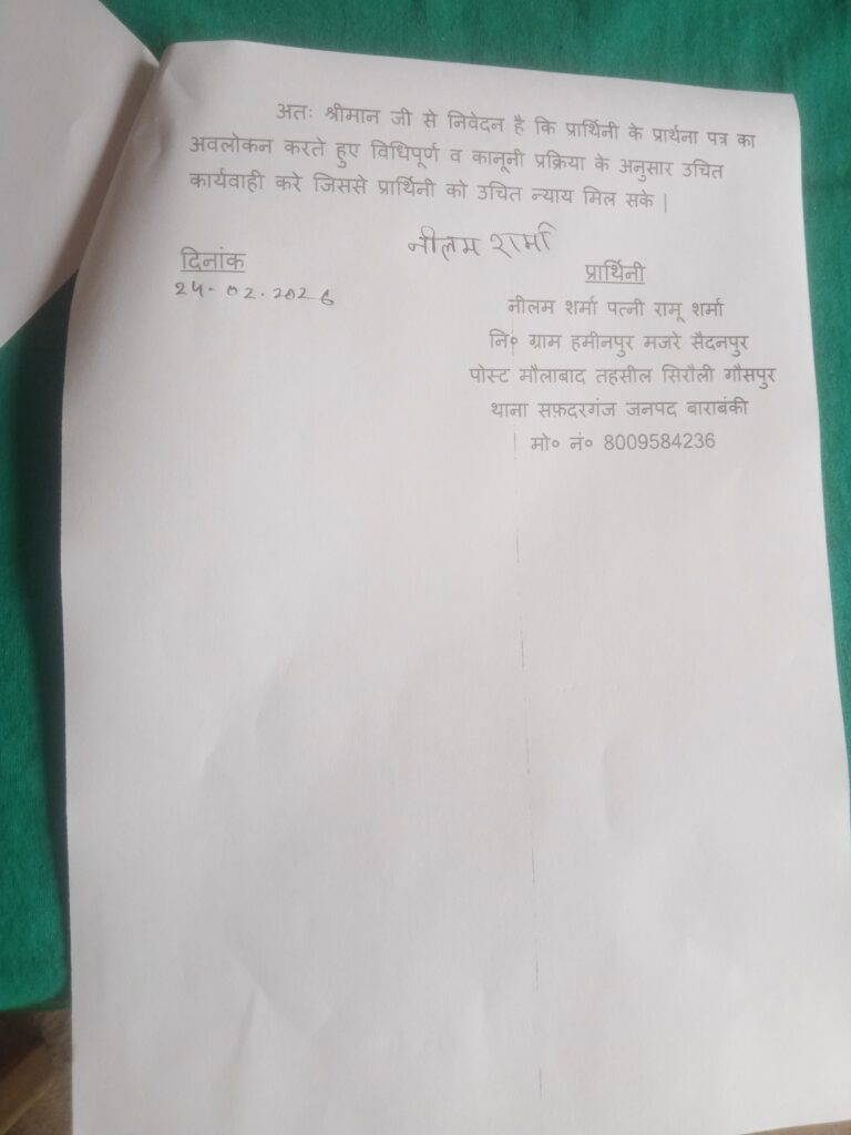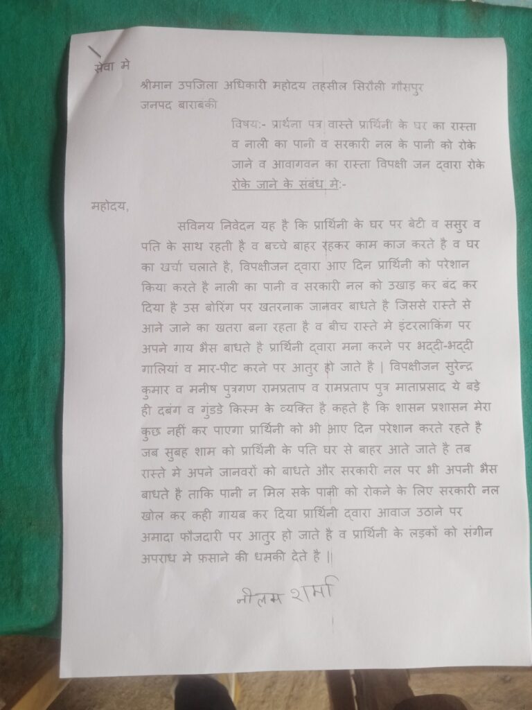 बाराबंकी सफदरगंज थाना क्षेत्र के अंतर्गत तहसील सिरौली गौसपुर के ग्राम हमीनपुर मजरे सैदानपुर मामला प्रकाश में आया है की हमीनपुर निवासी पीड़िता नीलम शर्मा पत्नी रामू शर्मा ने 24 2 2026 को उप जिला अधिकारी को प्रार्थना पत्र दिया जिसमें पीड़िता नीलम शर्मा का कहना है कि विपक्षी सुरेंद्र व मनीष पुत्र गण राम प्रताप एवं राम प्रताप पुत्र माता प्रसाद के द्वारा पीड़िता नीलम शर्मा को प्रताड़ित किए जाने का मामला सामने आया है जिसमें पीड़िता का कहना है कि विपक्षियों ने पीड़िता के नाली का पानी और रास्ता अवरुद्ध कर रखा है और सरकार द्वारा लगवाया जल निगम के नल उखाड़ कर गायब करके बोरिंग के पास विपक्षी अपने मारकहे जानवर बीच रास्ते में बांधते है पानी को लेकर के आए दिन विवाद करते हैं सरकारी नल हटाकर के अपने मारकहे जानवर बीच रास्ते में बांधते हैं जिसे पीड़िता को और उसके घर परिवार को आने-जाने एवं राहगीरों को काफी कठिनाइयों का सामना करना पड़ता है पीड़िता ने बताया कि विपक्षियों को कुछ कहनेके उपरांत विपक्षियों द्वारा भद्दी भद्दी गलियां एवं फर्जी मुकदमे में फसाने की धमकी दी जा रही है पीड़िता नीलम शर्मा ने उप जिलाधिकारी को प्रार्थना पत्र देकर न्याय की गुहार लगाई है