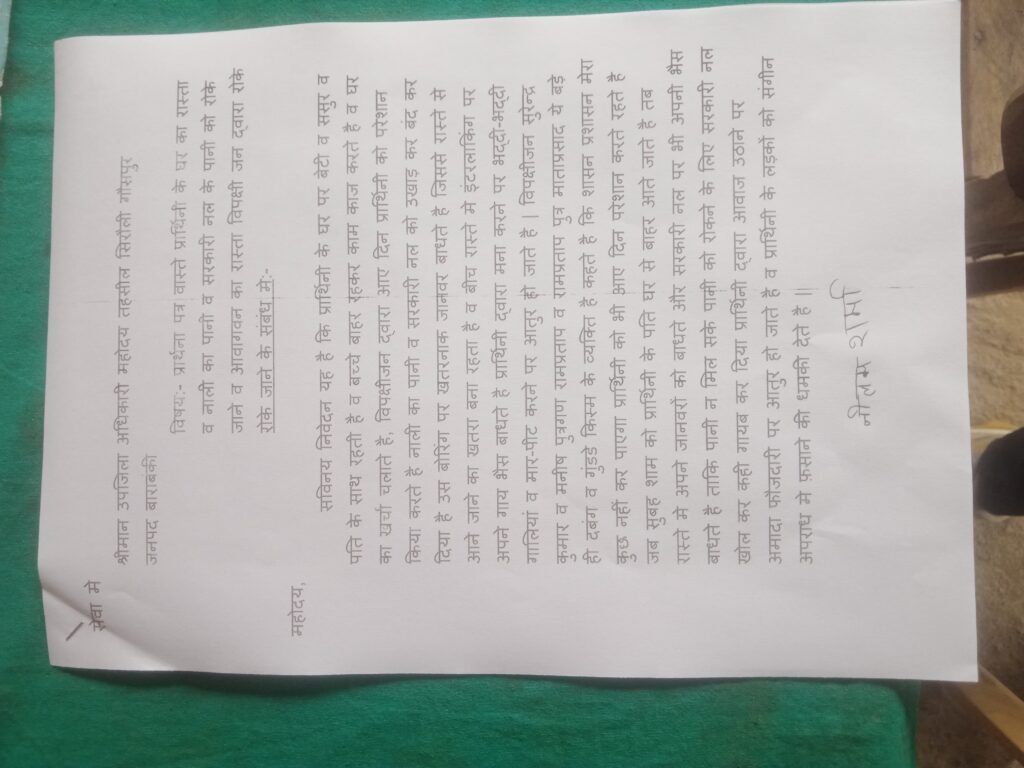 पानी को लेकर के आए दिन विवाद करते हैं सरकारी नल हटाकर के अपने मारकहे जानवर बीच रास्ते में बांधते हैं जिसे पीड़िता को और उसके घर परिवार को आने-जाने एवं राहगीरों को काफी कठिनाइयों का सामना करना पड़ता है पीड़िता ने बताया कि विपक्षियों को कुछ कहनेके उपरांत विपक्षियों द्वारा भद्दी भद्दी गलियां एवं फर्जी मुकदमे में फसाने की धमकी दी जा रही है पीड़िता नीलम शर्मा ने उप जिलाधिकारी को प्रार्थना पत्र देकर न्याय की गुहार लगाई है।