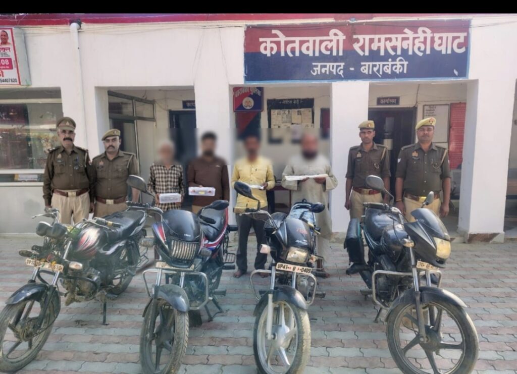 पुलिस अधीक्षक बाराबंकी अर्पित विजयवर्गीय द्वारा जनपद में अपराध एवं अपराधियों पर अंकुश लगाने तथा अभियुक्तों की गिरफ्तारी हेतु समस्त थाना प्रभारियों को निर्देशित किया गया। इसी क्रम में आज दिनांक 27.02.2026 को थाना रामसेहीघाट पुलिस टीम द्वारा 04 अभियुक्तों 1. मोहम्मद कासिम पुत्र स्व0 मोहम्मद जलील निवासी ग्राम हटिया सिद्धौर थाना असन्द्रा जनपद बाराबंकी 2. मोहम्मद कलीम पुत्र मोहम्मद मतीन निवासी सुसवई थाना असन्द्रा जनपद बाराबंकी 3. मोहम्मद अकमल पुत्र स्व0 मोहम्मद नफीस निवासी सुसवई थाना असन्द्रा जनपद बाराबंकी 4. शहाबुद्दीन पुत्र स्व0 वसीमुद्दीन निवासी भेजन टोला थाना असन्द्रा जनपद बाराबंकी को नाला पुलिया बनपुरवा के पास से गिरफ्तार किया गया। अभियुक्तगण मोहम्मद कासिम उपरोक्त के कब्जे से 01 अदद अवैध तमंचा .12 बोर व 01 अदद जिंदा कारतूस व मोहम्मद कलीम उपरोक्त के कब्जे से 01 अदद अवैध तमंचा .315 बोर व 01 अदद जिंदा कारतूस, अभियुक्त मोहम्मद अकमल के कब्जे से 01 अदद अवैध बांका व अभियुक्त शहाबुद्दीन के कब्जे से 01 अदद अवैध चाकू व कुल 04 अदद मोटर साइकिल बरामद किया गया। उक्त बरामदगी के आधार पर थाना रामसनेहीघाट पर मु0अ0सं0-77/2026 धारा 3/25 व 4/25 आर्म्स एक्ट पंजीकृत किया गया।