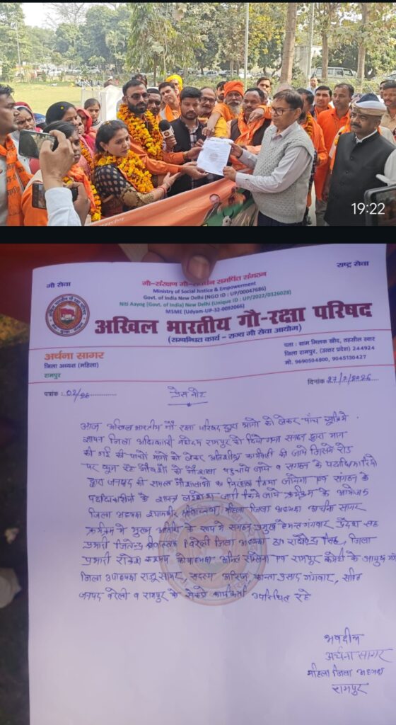 रामपुर: अखिल भारतीय गो-रक्षा परिषद ने गोवंश संरक्षण को लेकर पाँच सूत्रीय मांगों का ज्ञापन जिलाधिकारी अधिकारियों को सौंपा। ज्ञापन में अवैध कटान व तस्करी पर रोक, सड़कों पर घूम रहे गोवंश की व्यवस्था, गौशालाओं को निर्देश जारी करने तथा संगठन पदाधिकारियों पर दर्ज मुकदमे वापस लेने की मांग की गई। इस दौरान संगठन के कई पदाधिकारी मौजूद रहे। ज्ञापन महिला जिला अध्यक्ष अर्चना सागर के नेतृत्व में दिया गया।