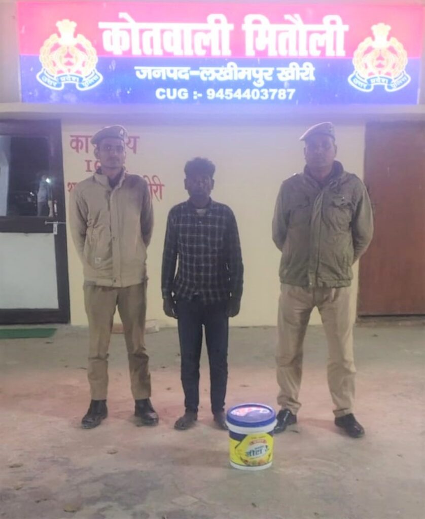 मितौली खीरी, 1 मार्च 2026। पुलिस अधीक्षक खीरी डा0 ख्याति गर्ग के निर्देशन में सम्पूर्ण जनपद में अवैध शराब की कसीदगी की रोकथाम हेतु चलाये जा रहे अभियान के अंतर्गत अपर पुलिस अधीक्षक खीरी के पर्यवेक्षण व क्षेत्राधिकारी मितौली के कुशल मार्ग दर्शन तथा प्रभारी निरीक्षक मितौली महेश पाठक के नेतृत्व में कोतवाली मितौली खीरी की पुलिस टीम व आबकारी टीम द्वारा संयुक्त टीम बनाकर दिनांक 28.02.2026 को अवैध कच्ची शराब बेचने वाले अभियुक्त को गिरफ्तार कर थाना मितौली पर मु0अ0सं0 089/2026 धारा 60 आबकारी अधि0 बनाम राजेन्द्र पुत्र बनवारी लाल निवासी उत्तरी मोहल्ला कस्बा मितौली थाना मितौली जनपद खीरी पंजीकृत कर विधिक कार्यवाही की जा रही है ।