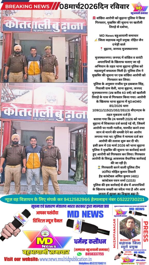 इसी क्रम में 08 मार्च 2026 को थाना बुढ़ाना पुलिस ने मुखबिर की सूचना पर कार्रवाई करते हुए आरोपी को गिरफ्तार कर लिया। गिरफ्तार आरोपी के विरुद्ध आवश्यक वैधानिक कार्रवाई की जा रही है।