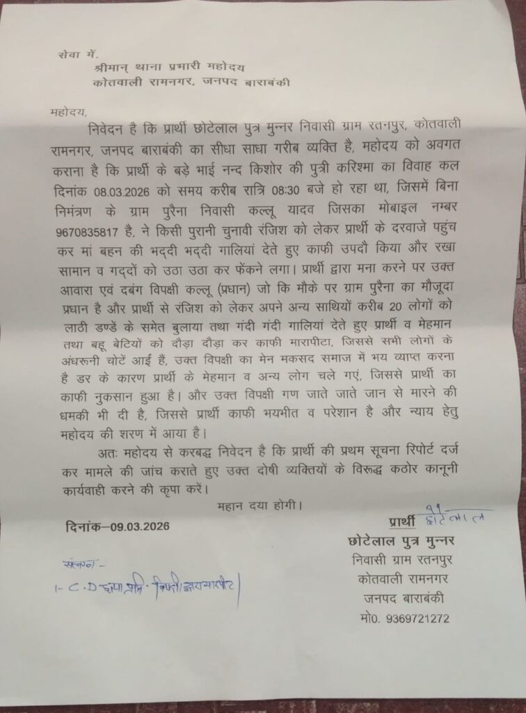 बाराबंकी थाना रामनगर जनपद बाराबंकी की ग्राम पंचायत रतनपुर में दिनांक 8 3.2026 को रतनपुर निवासी नंदकिशोर की पुत्री की बारात आई थी लोग खुशियों में झूम रहे थे और महिलाएं मंगल गीत गा रही थी और चारों तरफ हर्ष और उल्लास का माहौल था तभी रतनपुर पुरैना ग्राम प्रधान कल्लू यादव नशे में धुत होकर विवाह में बिना निमंत्रण के अपने 10 15 समर्थकों के साथ पहुंचे चुनावी रंजिश को लेकर ग्राम प्रधान कल्लू यादव ने भद्दी भद्दी गालियां देना शुरू कर दिया जब लोगों ने रोकने का प्रयास किया तब प्रधान और उग्र हो गए बेटी के विवाह के लिए खरीदे गए समान को उठाकर इधर-उधर फेंकने लगे प्रधान का मन इतने से नहीं भरा तो फोन कर अपने 20 से अधिक समर्थकों के साथ लाठी डंडे लेकर आ गए विवाह में शामिल लोग भयभीत हो गए और कई लोग डर के मारे बिना भोजन किया वापस हो गए प्रधान और प्रधान समर्थकों ने कई रिश्तेदारों और महिलाओं को दौड़ा-दौड़ा कर पीटा जिनमें कई लोगों को अंदरूनी चोटे आई पीड़ित ने मामला बढ़ता देख 112 नंबर पीआरबी को फोन किया पीआरबी को देखते ही प्रधान और उनके समर्थक भाग खड़े हुए एक पिता पर क्या गुजरी होगी जिसने कई सालों से अपने बेटी के हाथ पीले करने के लिए कितना परिश्रम किया होगा लेकिन नंदकिशोर को या नहीं पता था की पुत्री के विवाह में ऐसीअर्चने आ जाएंगी लेकिन अब देखना यह है कि पुलिस प्रशासन पीडित को कैसे न्याय दिलाता है प्रार्थी ने रामनगर कोतवाली और मुख्यमंत्री पुलिस अधीक्षक बाराबंकी से प्रार्थना पत्र देकर न्याय की गुहार लगाई है। ब्यूरो चीफ रामानंद सागर